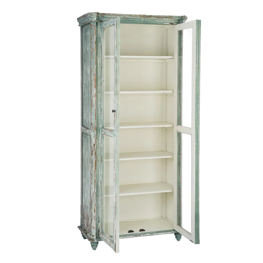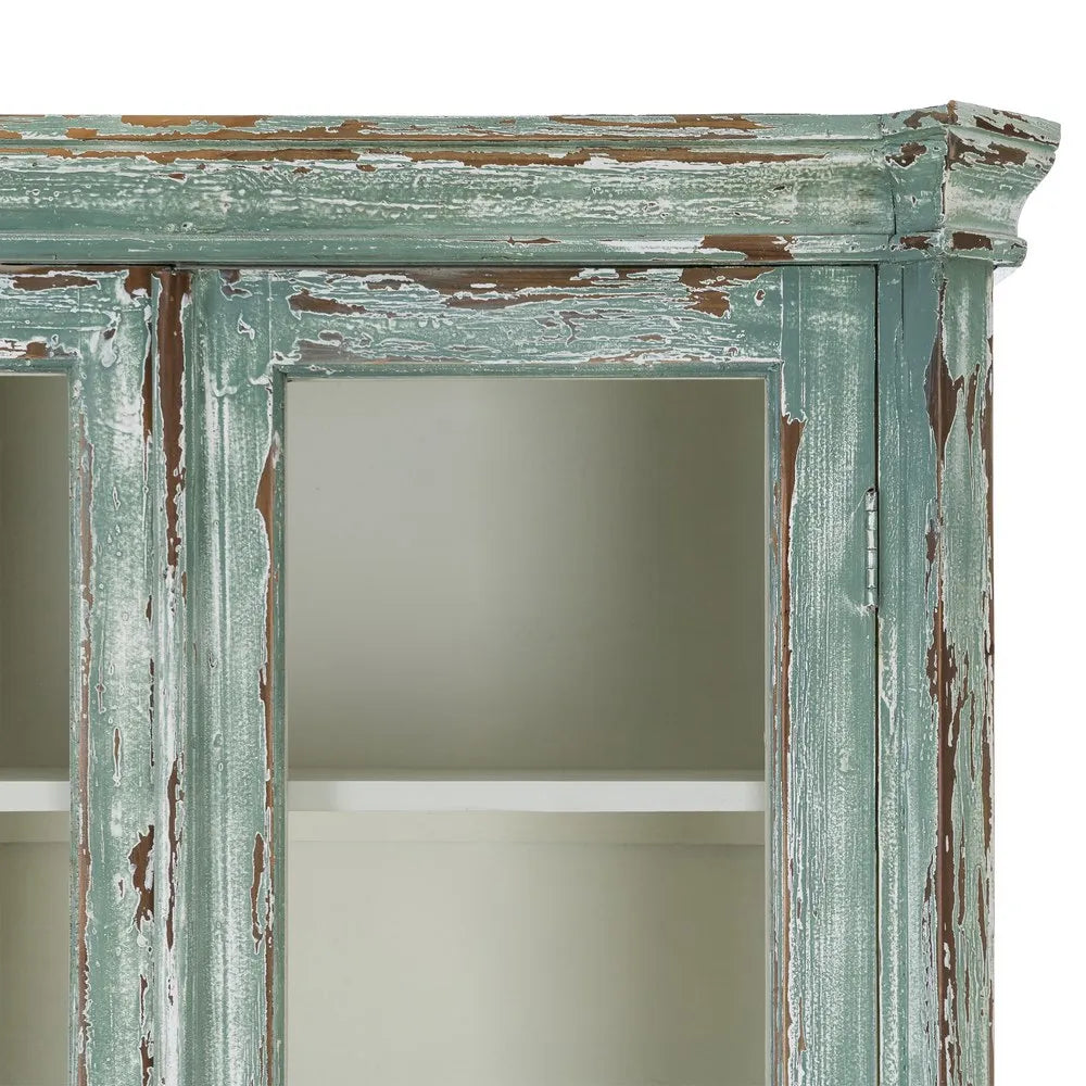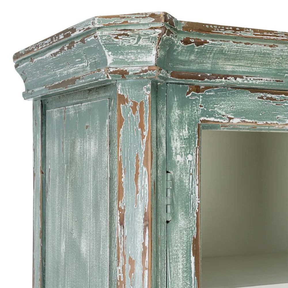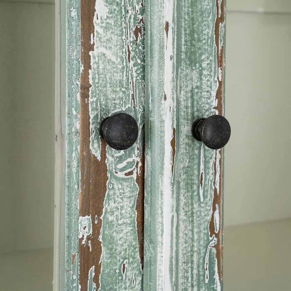 La vitrina de madera reciclada Salón 101 es una pieza de carácter artesanal con una estética equilibrada entre lo rústico y lo mediterráneo. Su acabado envejecido en tono verde agua, con ligeros desgastes que dejan ver la madera, aporta luminosidad y un aire natural que encaja fácilmente en espacios serenos y con personalidad. Las puertas acristaladas aligeran visualmente el conjunto y permiten exponer vajilla, libros u objetos decorativos con elegancia.