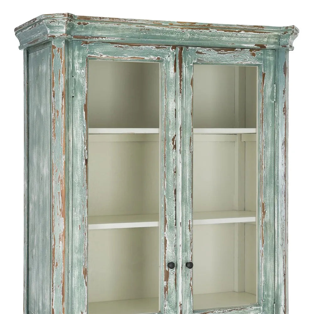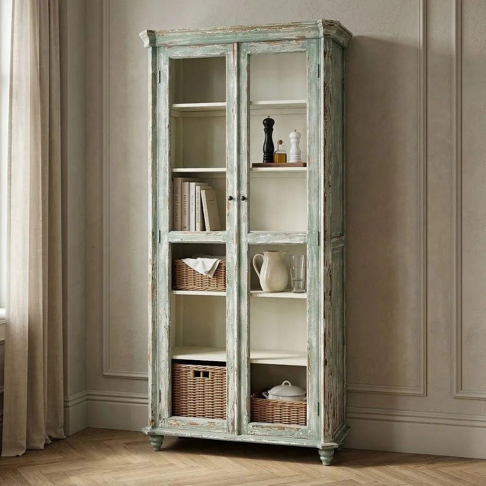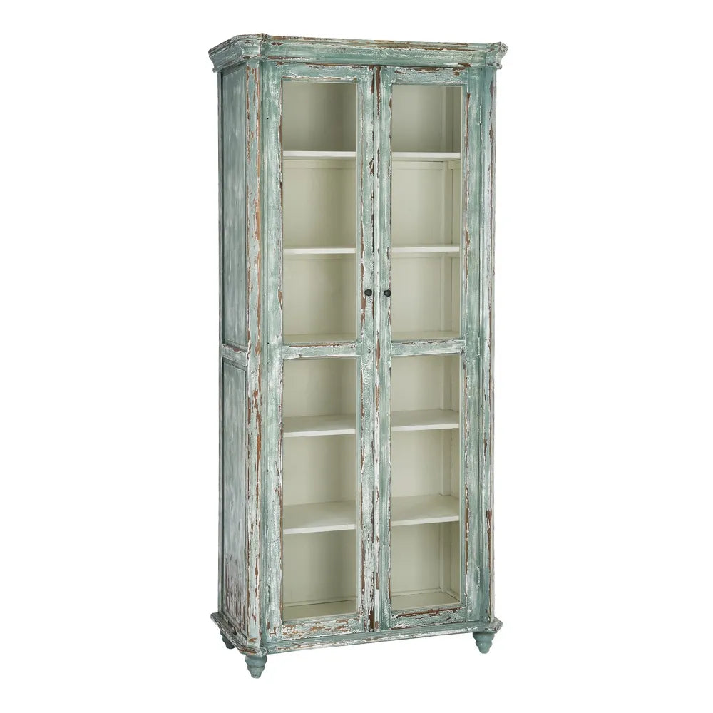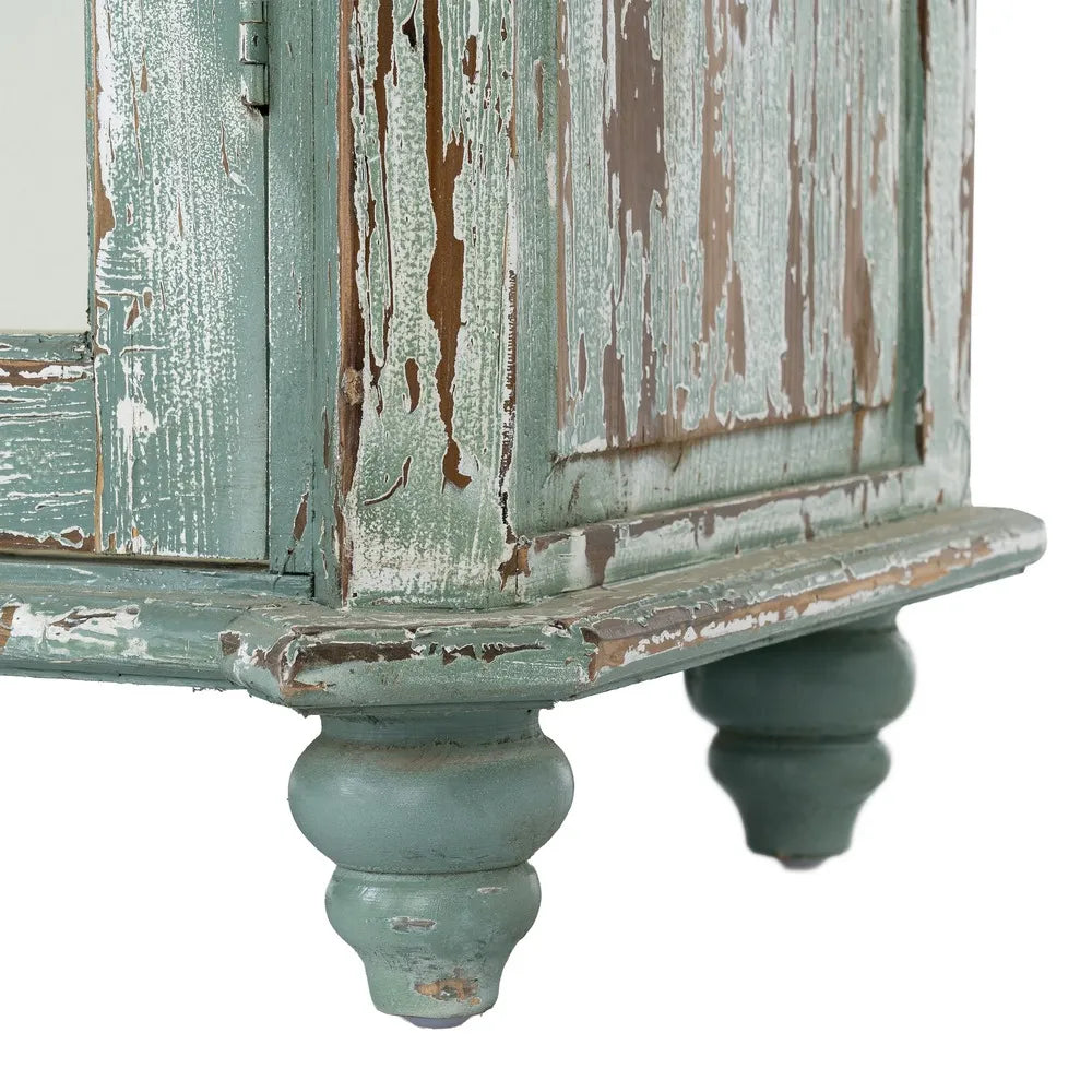 La vitrina de madera reciclada Salón 101 es una pieza de carácter artesanal con una estética equilibrada entre lo rústico y lo mediterráneo. Su acabado envejecido en tono verde agua, con ligeros desgastes que dejan ver la madera, aporta luminosidad y un aire natural que encaja fácilmente en espacios serenos y con personalidad. Las puertas acristaladas aligeran visualmente el conjunto y permiten exponer vajilla, libros u objetos decorativos con elegancia.