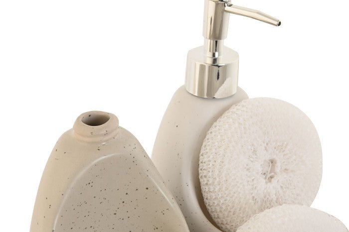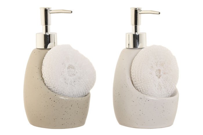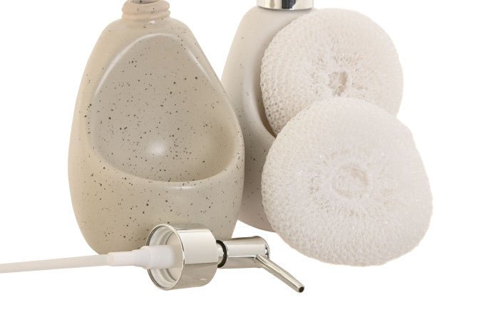 Este refinado dispensador de jabón con esponja de burbujas está elaborado en gres de alta calidad, con un delicado acabado en tonos beige y blanco que aportan calidez, armonía y un aire natural a cualquier espacio de baño o cocina.