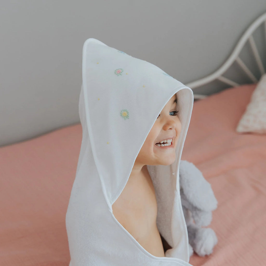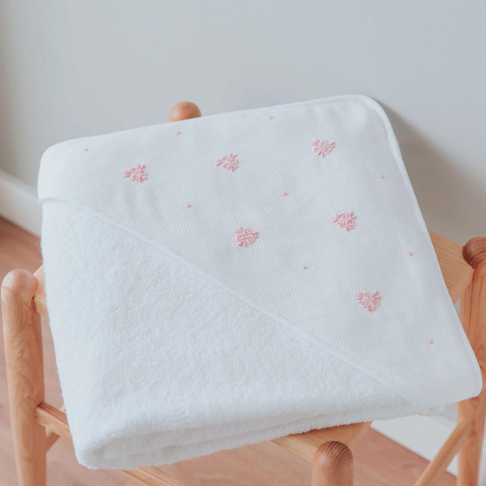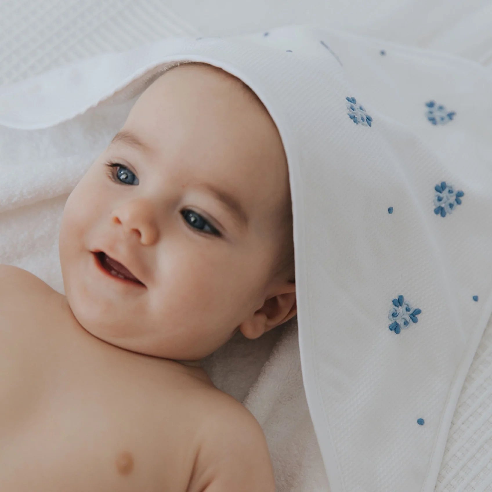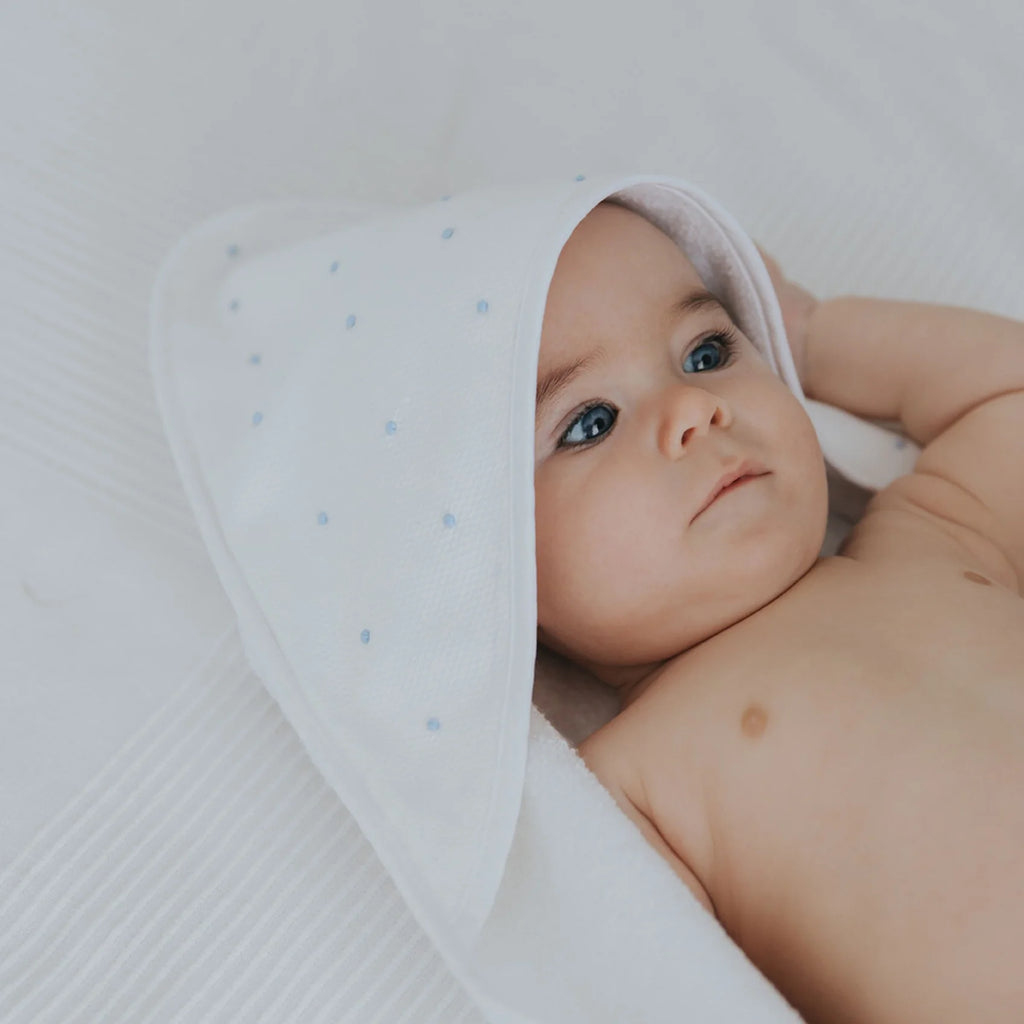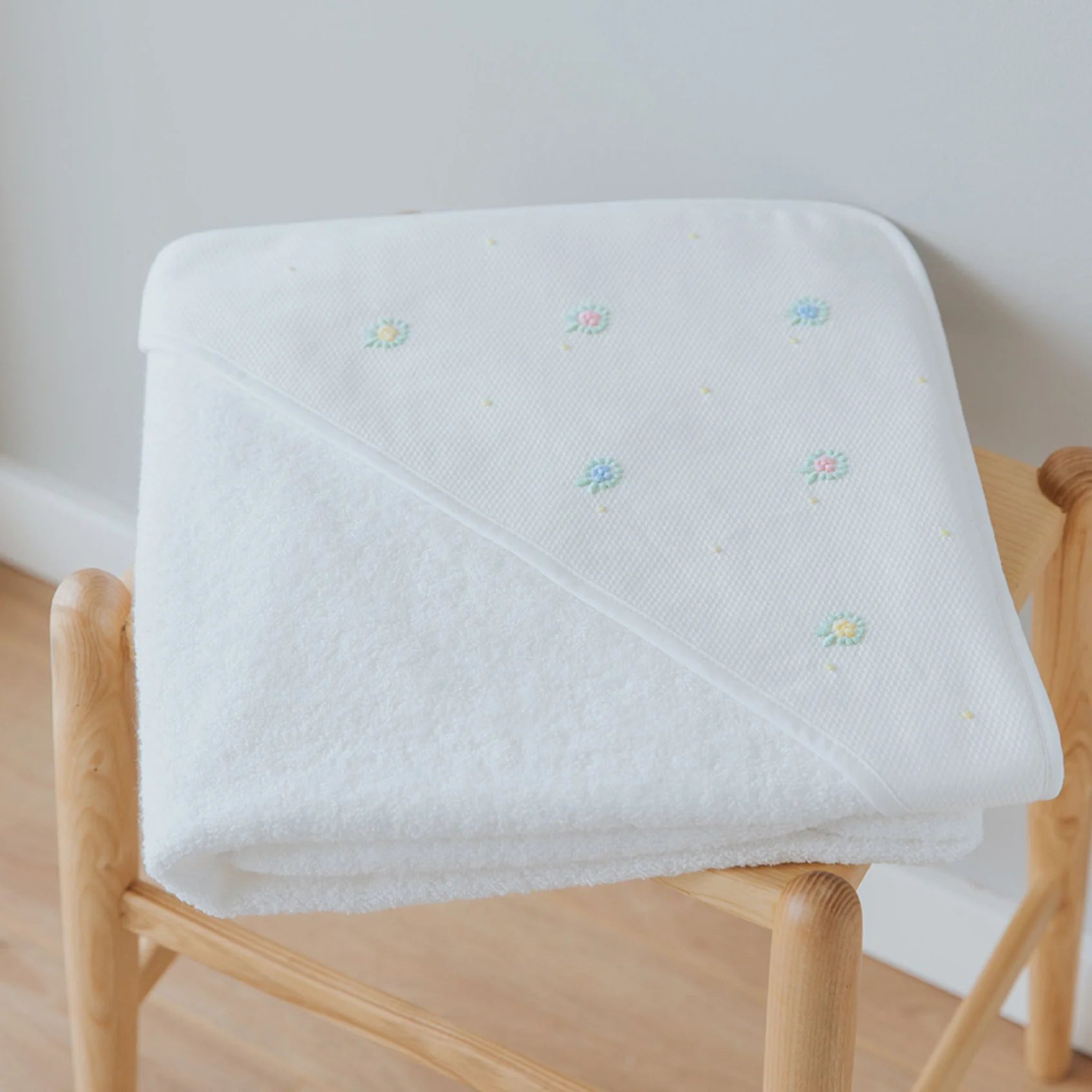Esta toalla de bebé está confeccionada en Portugal y pensada para ofrecer una suavidad excepcional a la piel delicada de los más pequeños. Cada pieza está bordada a mano siguiendo técnicas tradicionales de la isla de Madeira, lo que le aporta un encanto único y un acabado artesanal muy cuidado.