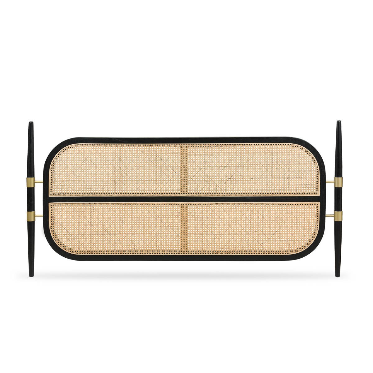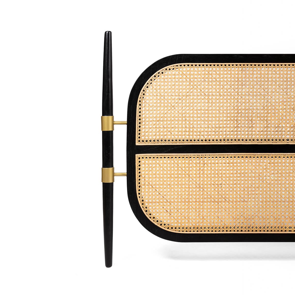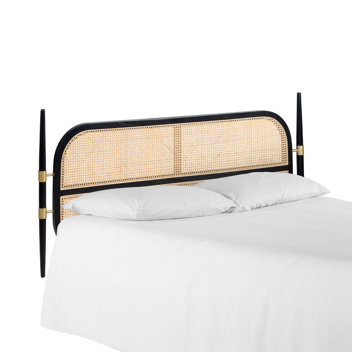 Cabecero de ratán y madera de cedro procedente de bosques sostenibles con metal de color natural, negro y dorado.