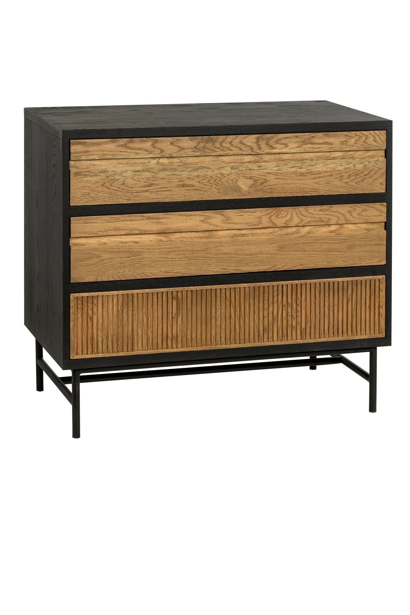 Cómoda fabricada en madera de roble en color natural y negro y estructura de patas en hierro color negro.