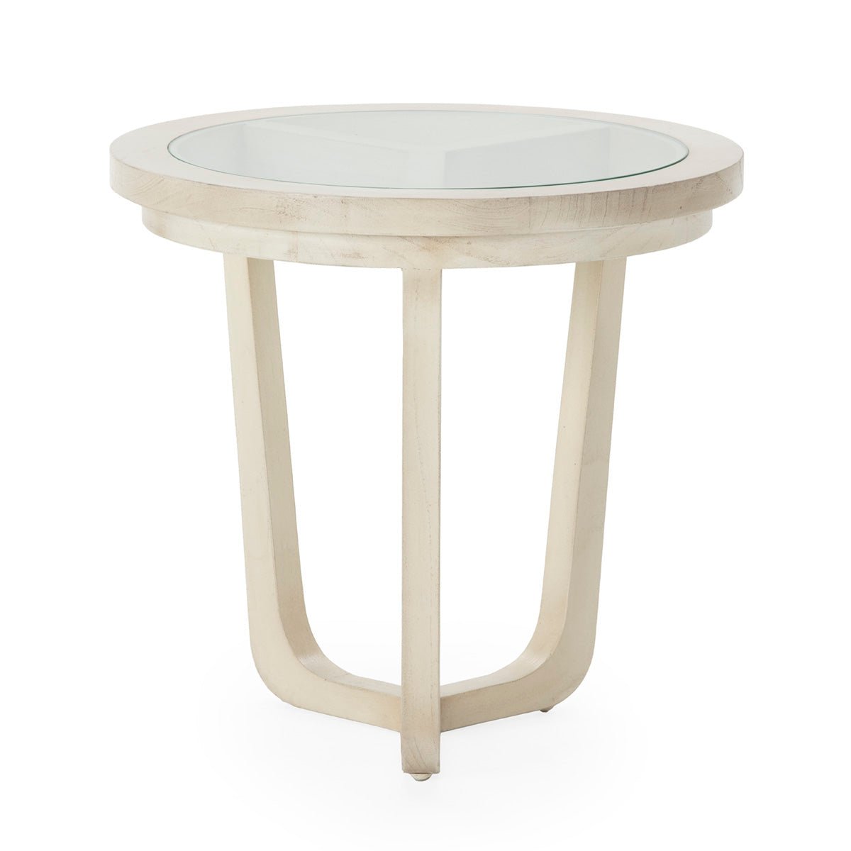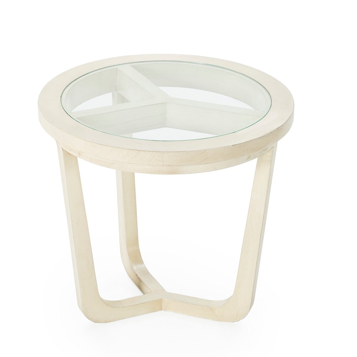 Preciosa mesa auxiliar redonda con estructura fabricada en madera de cedro color blanco velado y natural con tapa en cristal.