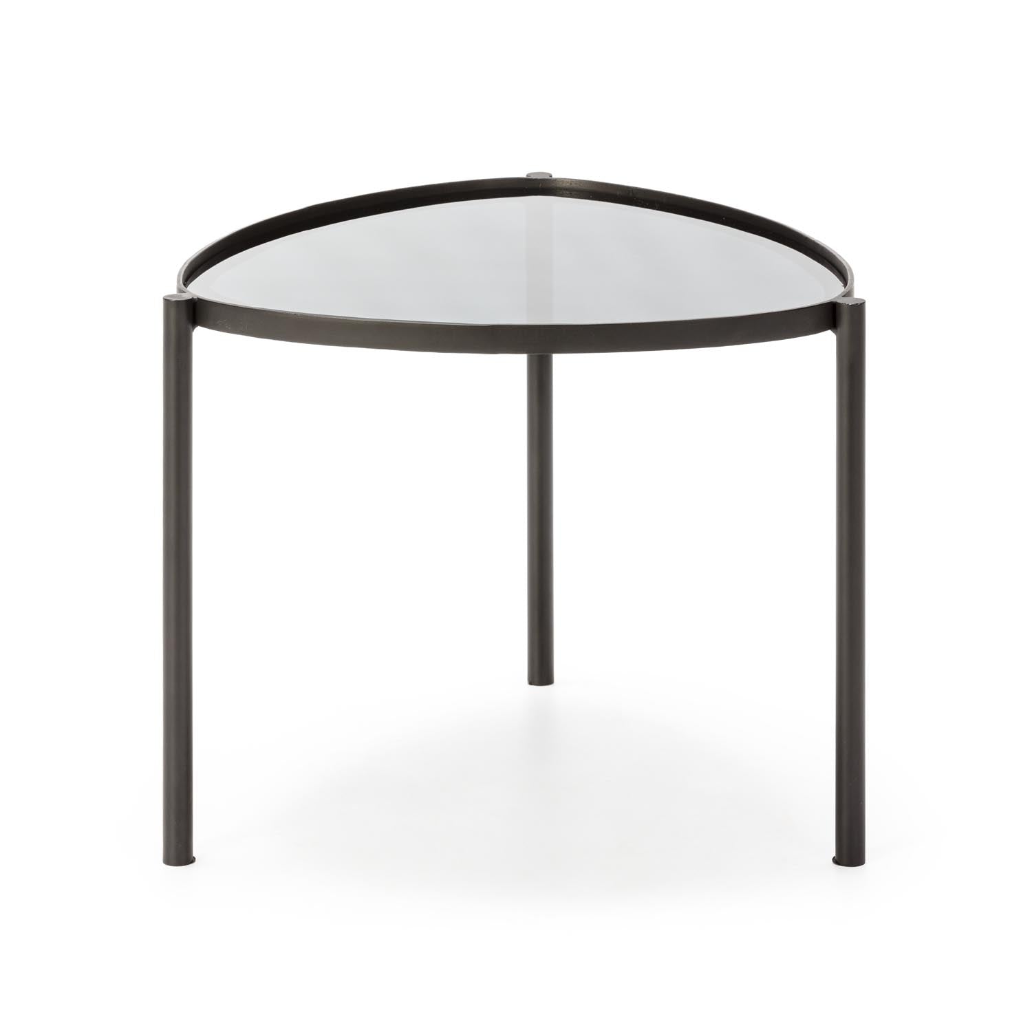 Mesa auxiliar con tapa de cristal transparente y estructura en metal color negro.