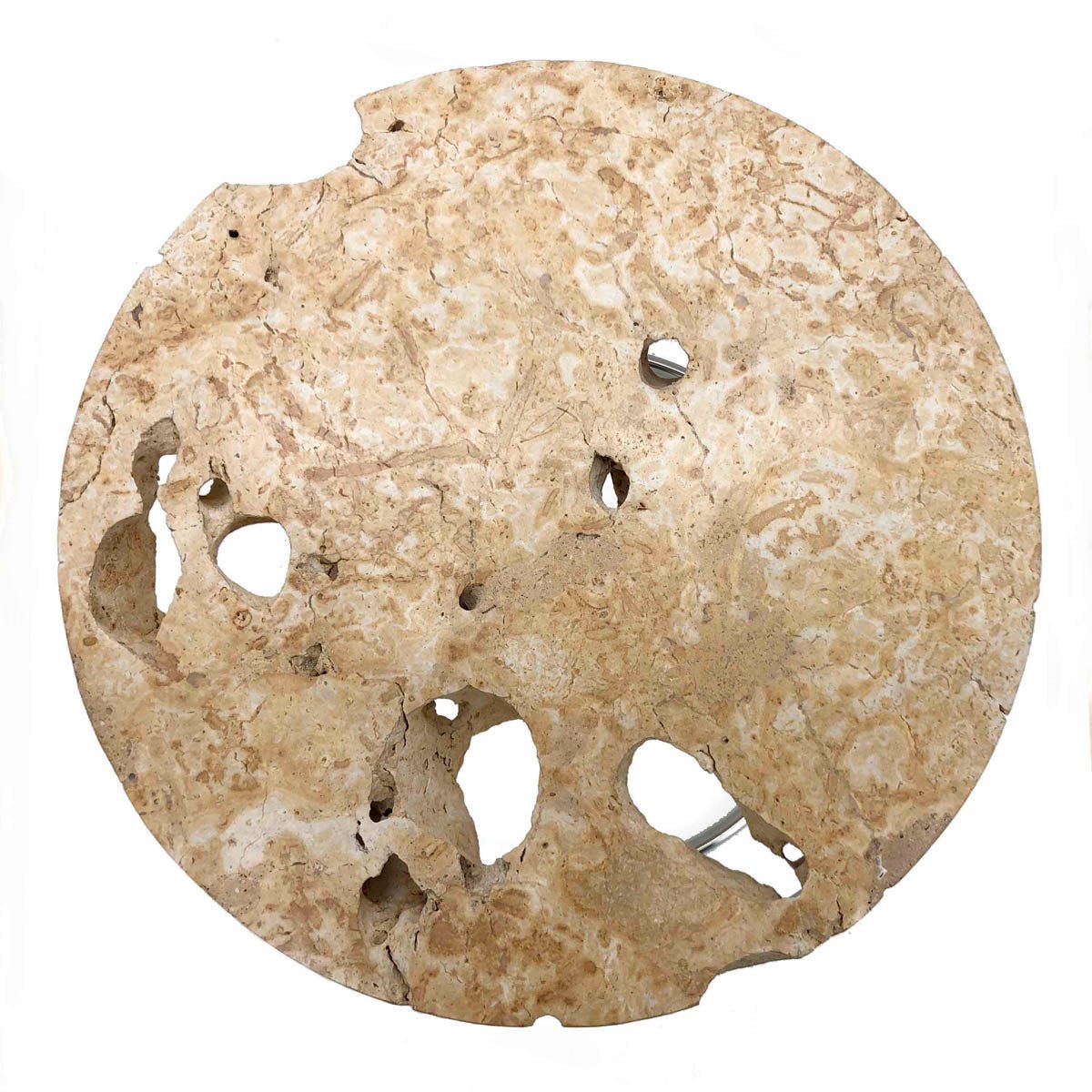 Mesas auxiliar redonda de piedra natural y estructura de acero color plata.