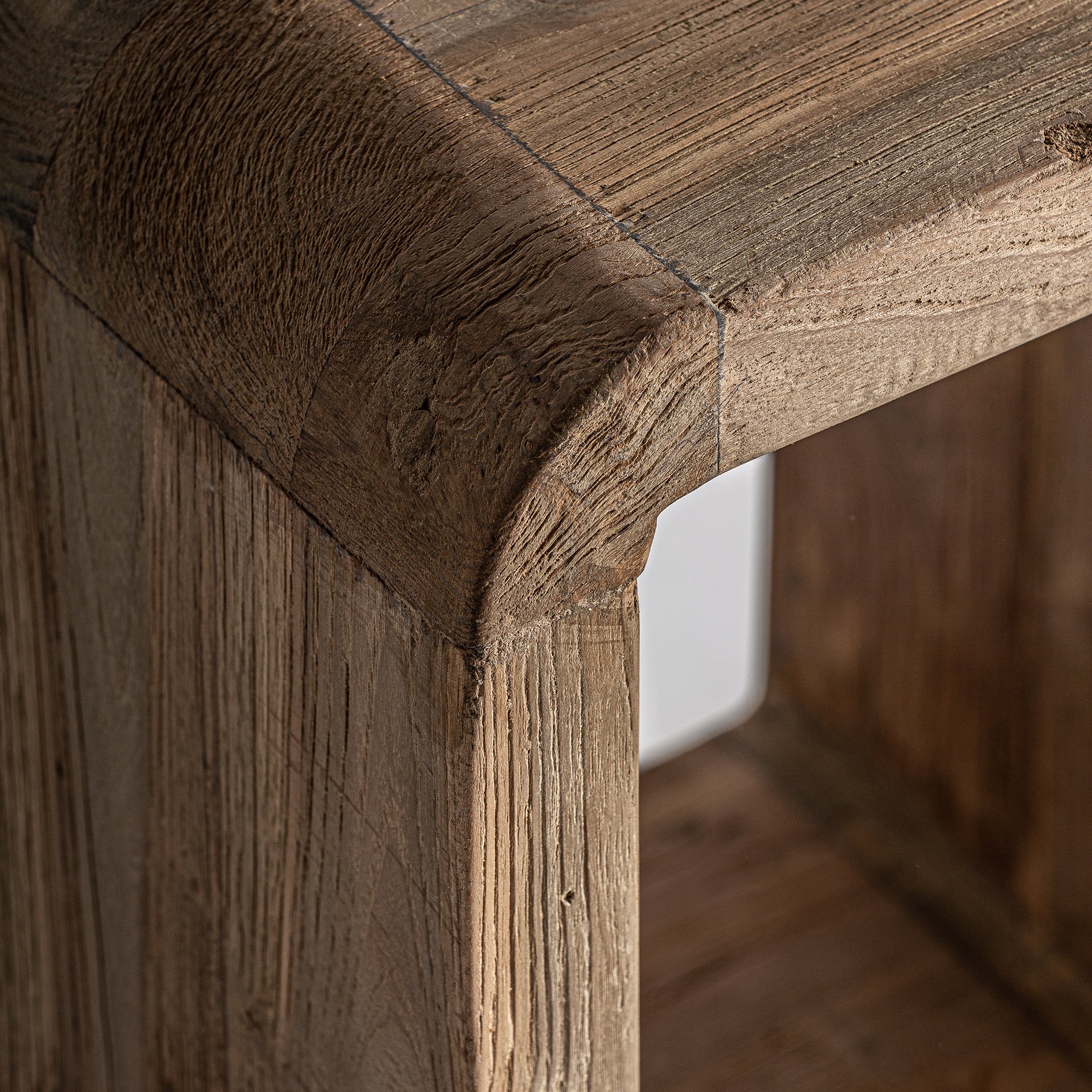 Mesa auxiliar en color natural fabricada en madera de teca reciclada. Patas con tacos regulables.