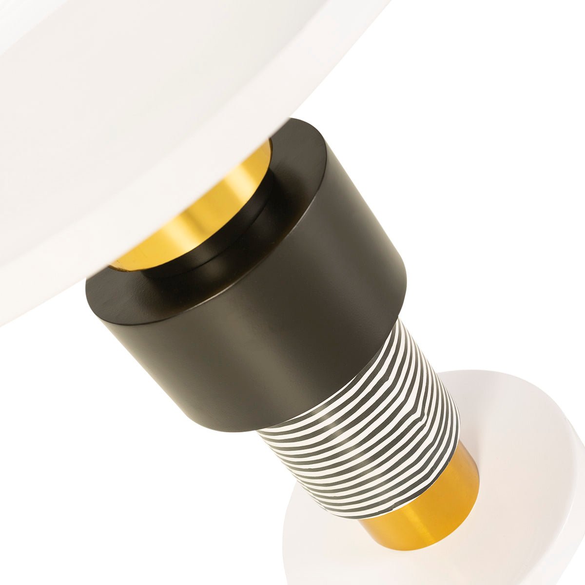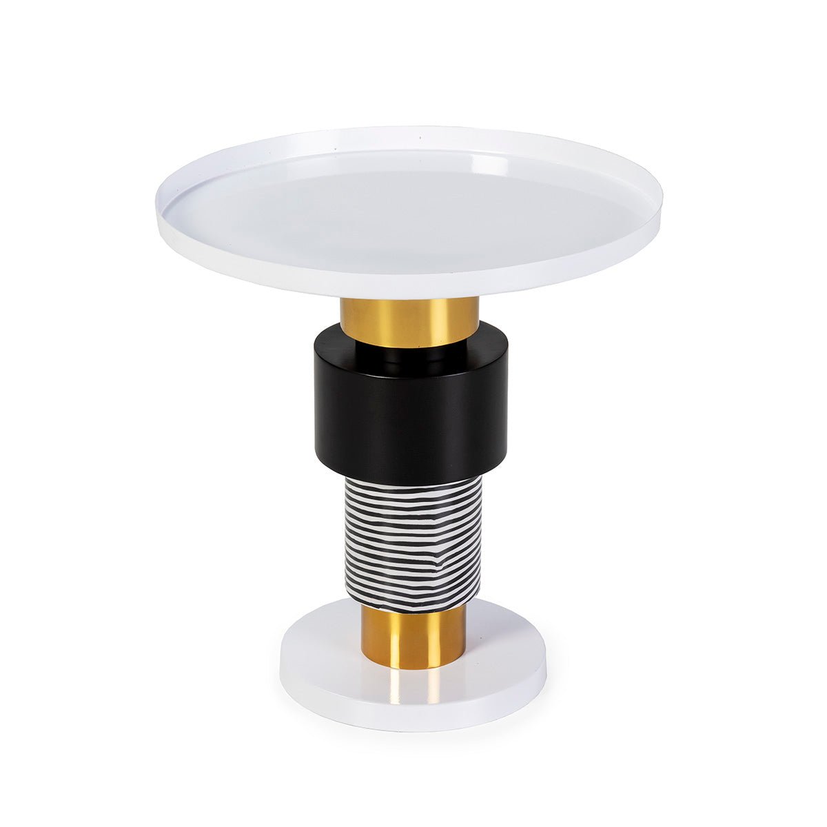 Mesa auxiliar redonda con tapa y base en metal blanco y estructura de patas en metal negro, dorado y blanco.