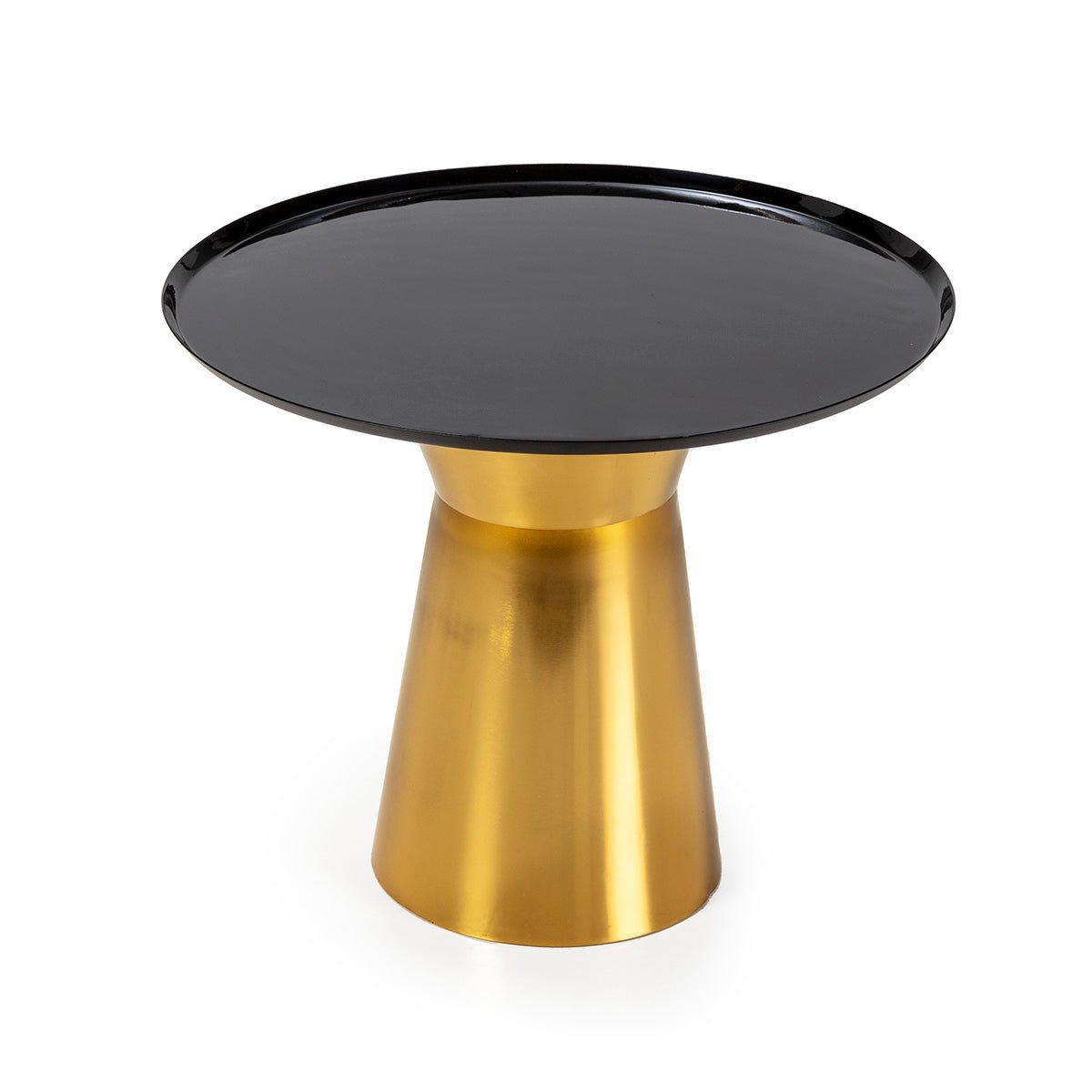 Mesa auxiliar redonda con tapa en metal color negro y estructura de patas en metal color dorado.