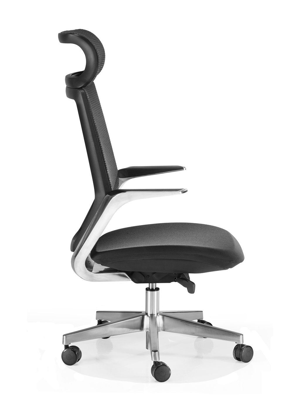 - Base piramidal de aluminio pulido de 5 radios (Ø69 cm), con pistón cromado y ruedas de perfil alto de 60 mm con banda de goma blanda.