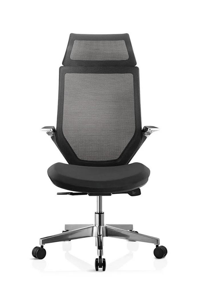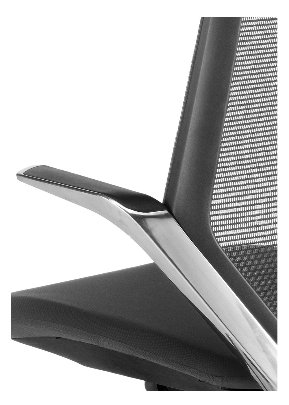 - Cabecero integrado con diseño direccional, tapizado en malla a juego con el respaldo.