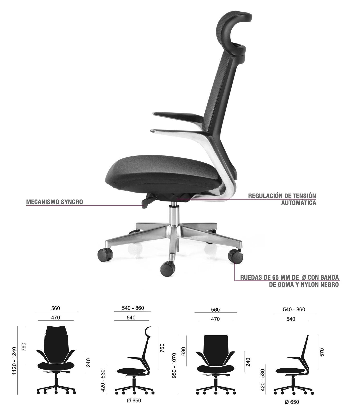 - Mecanismo Syncron: movimiento sincronizado del respaldo y asiento, sistema anti-retorno y bloqueo en 4 posiciones.