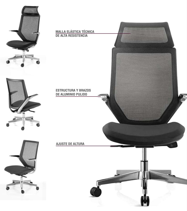 - Respaldo fabricado en nylon inyectado reforzado, con tapizado en malla técnica transpirable y de alta resistencia.