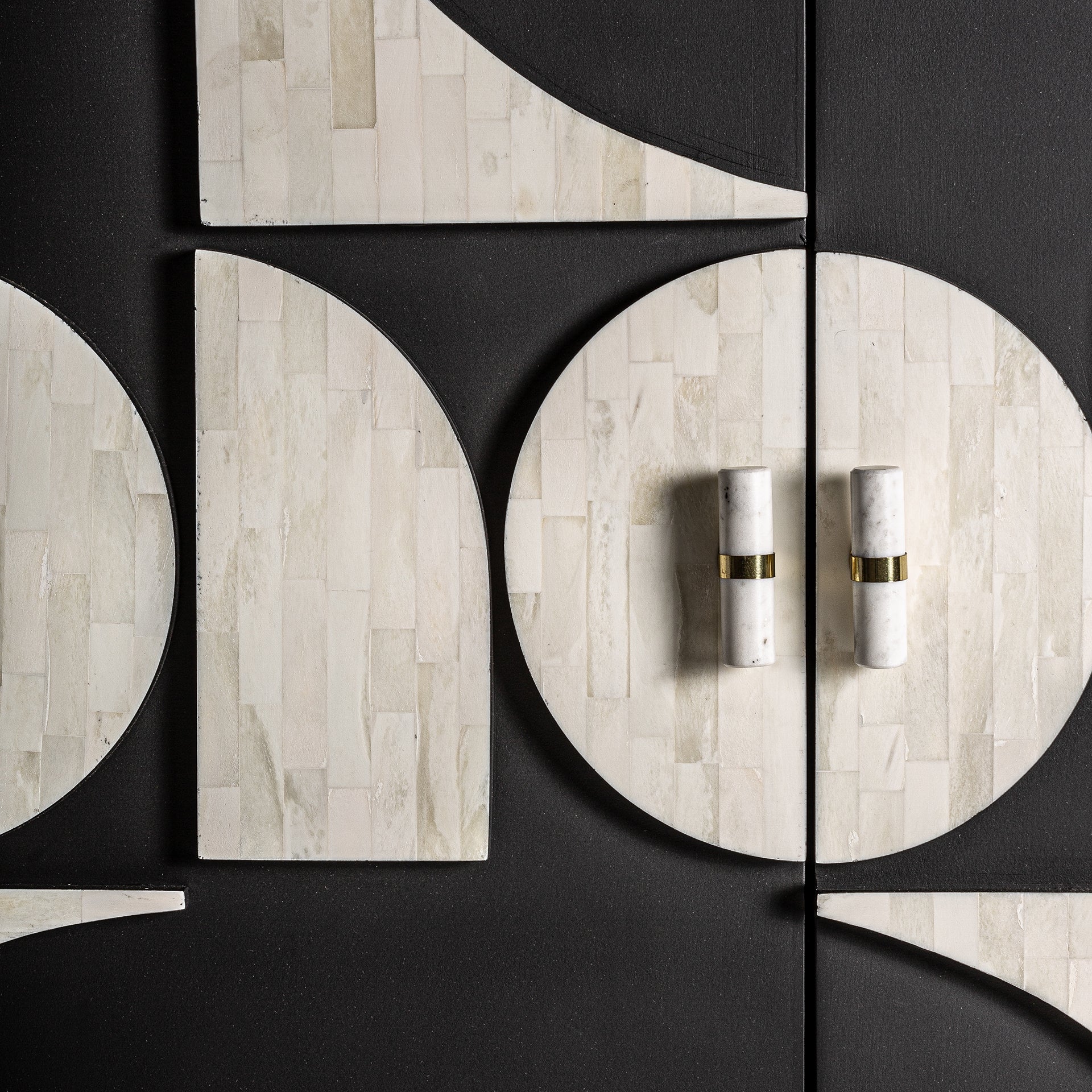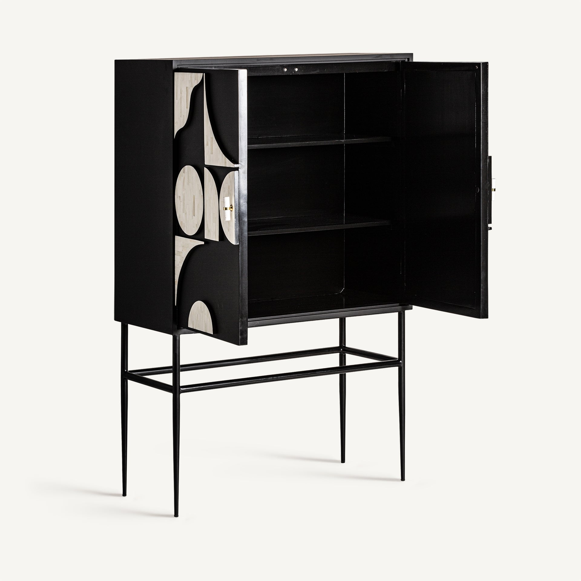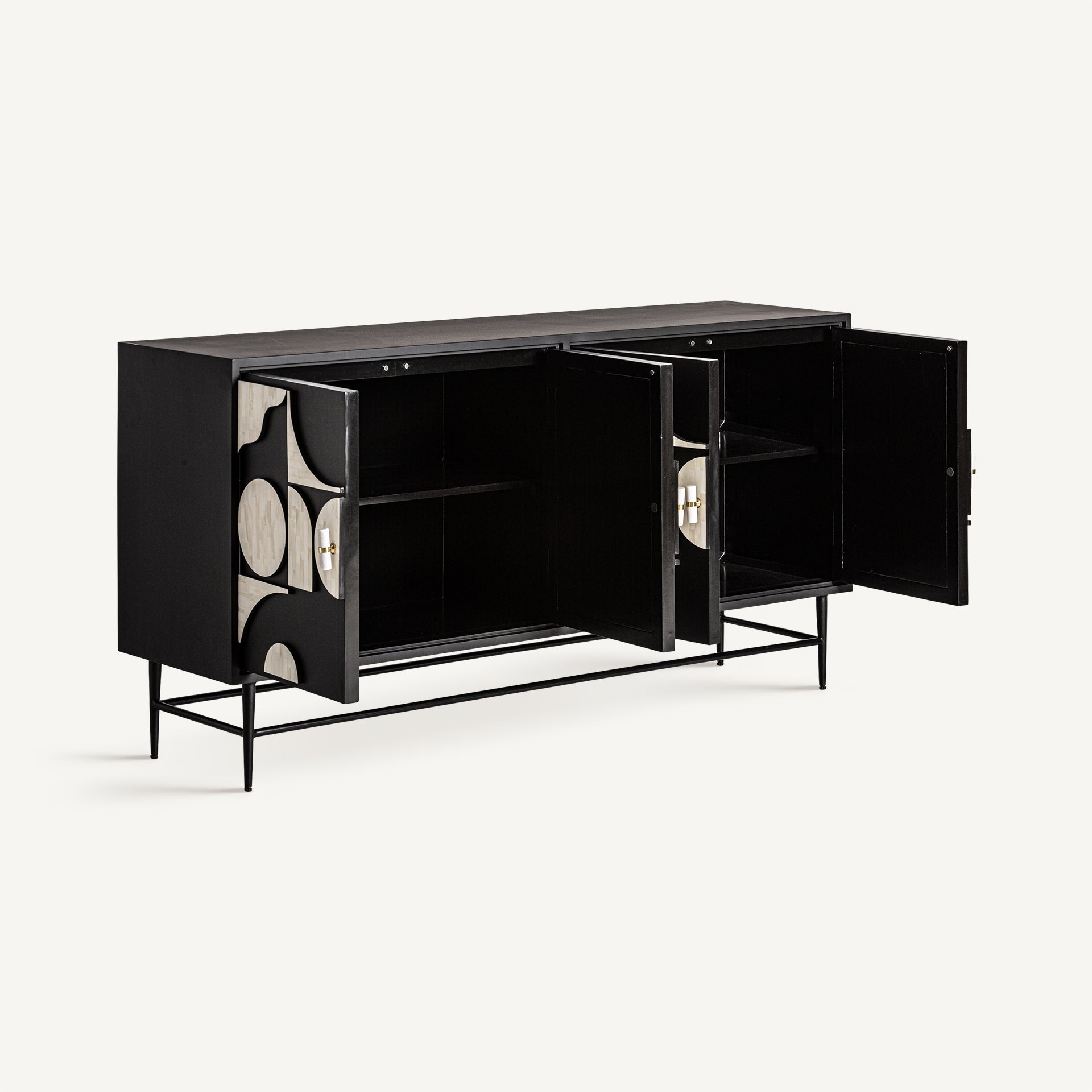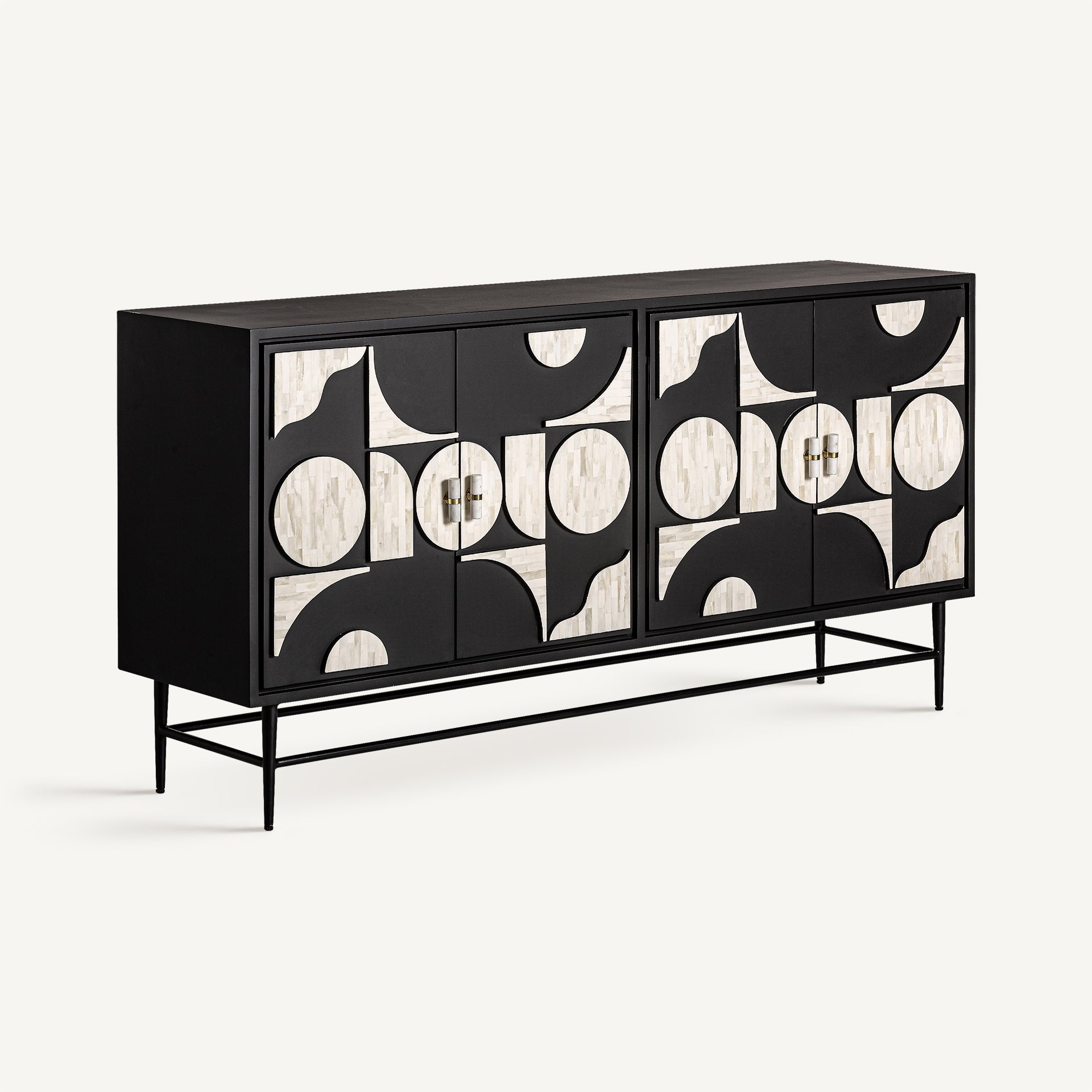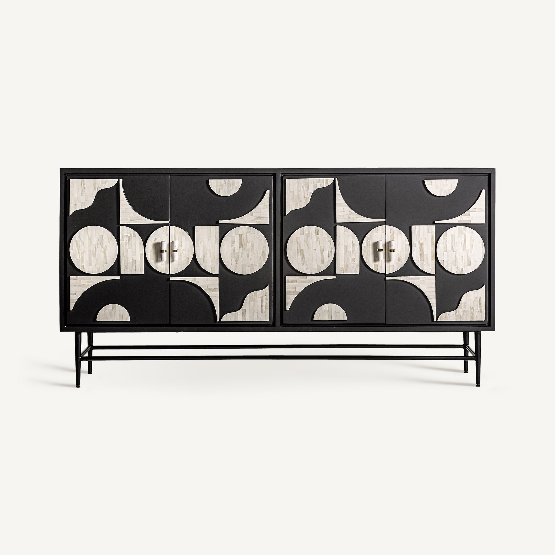Aparador imprescindible para los amantes del diseño, realizado en hierro y detallado en negro y hueso blanco, ofrece un diseño atemporal con la robustez del hierro perfecto para espacios con carácter.