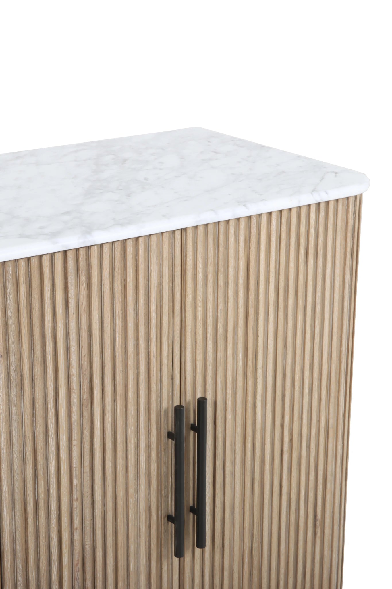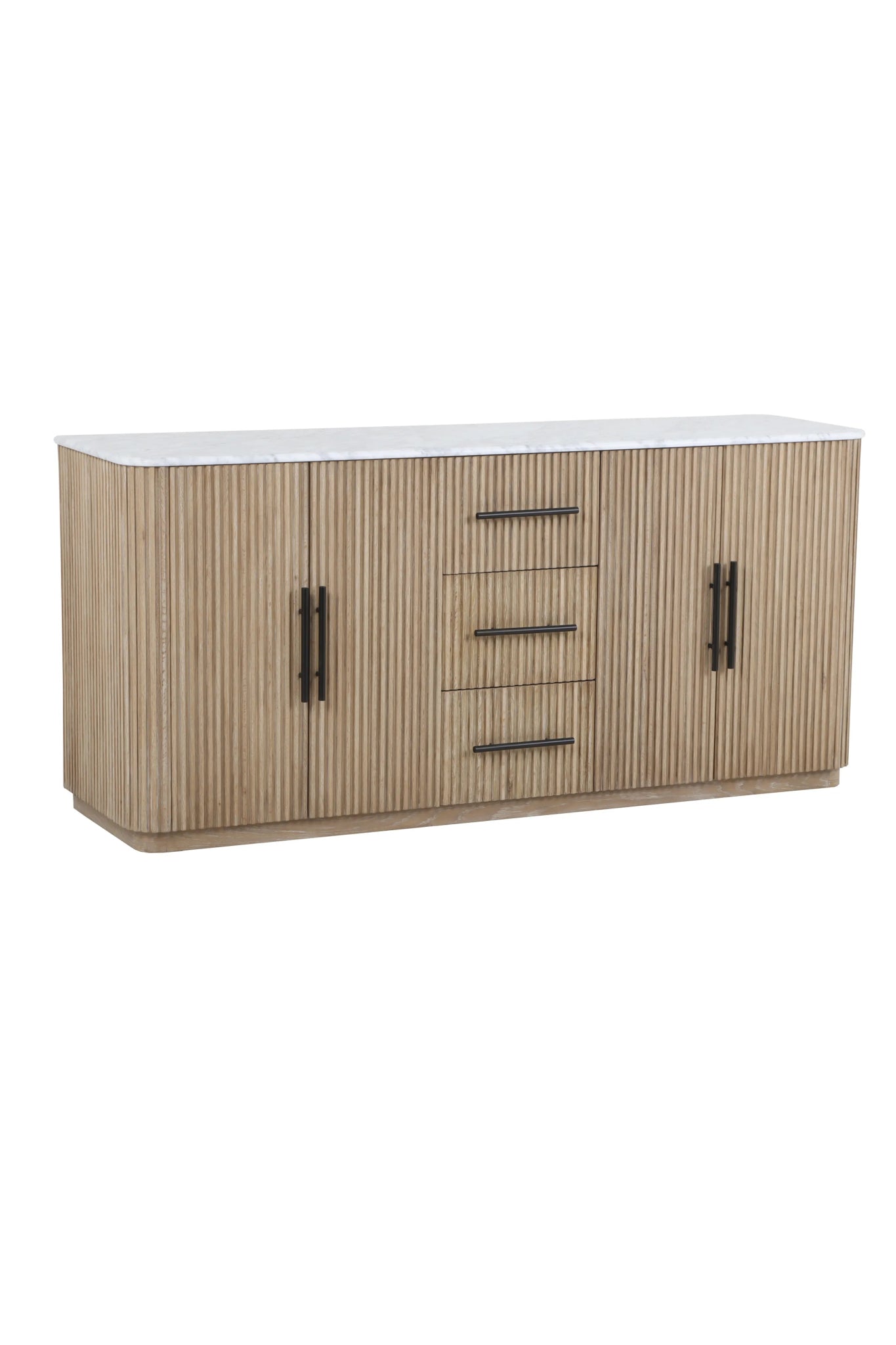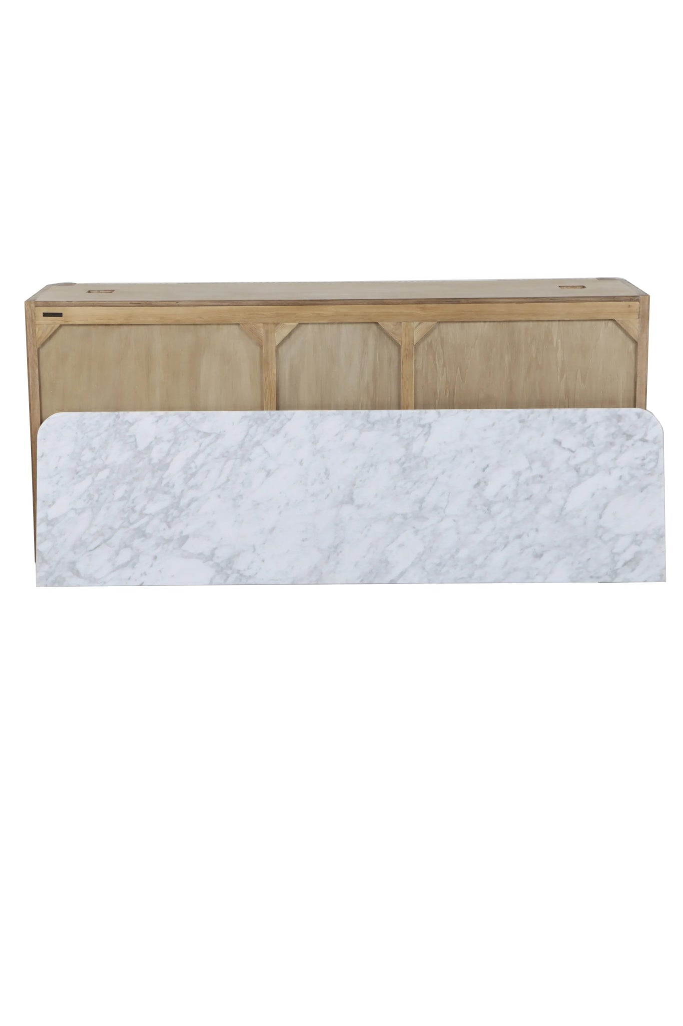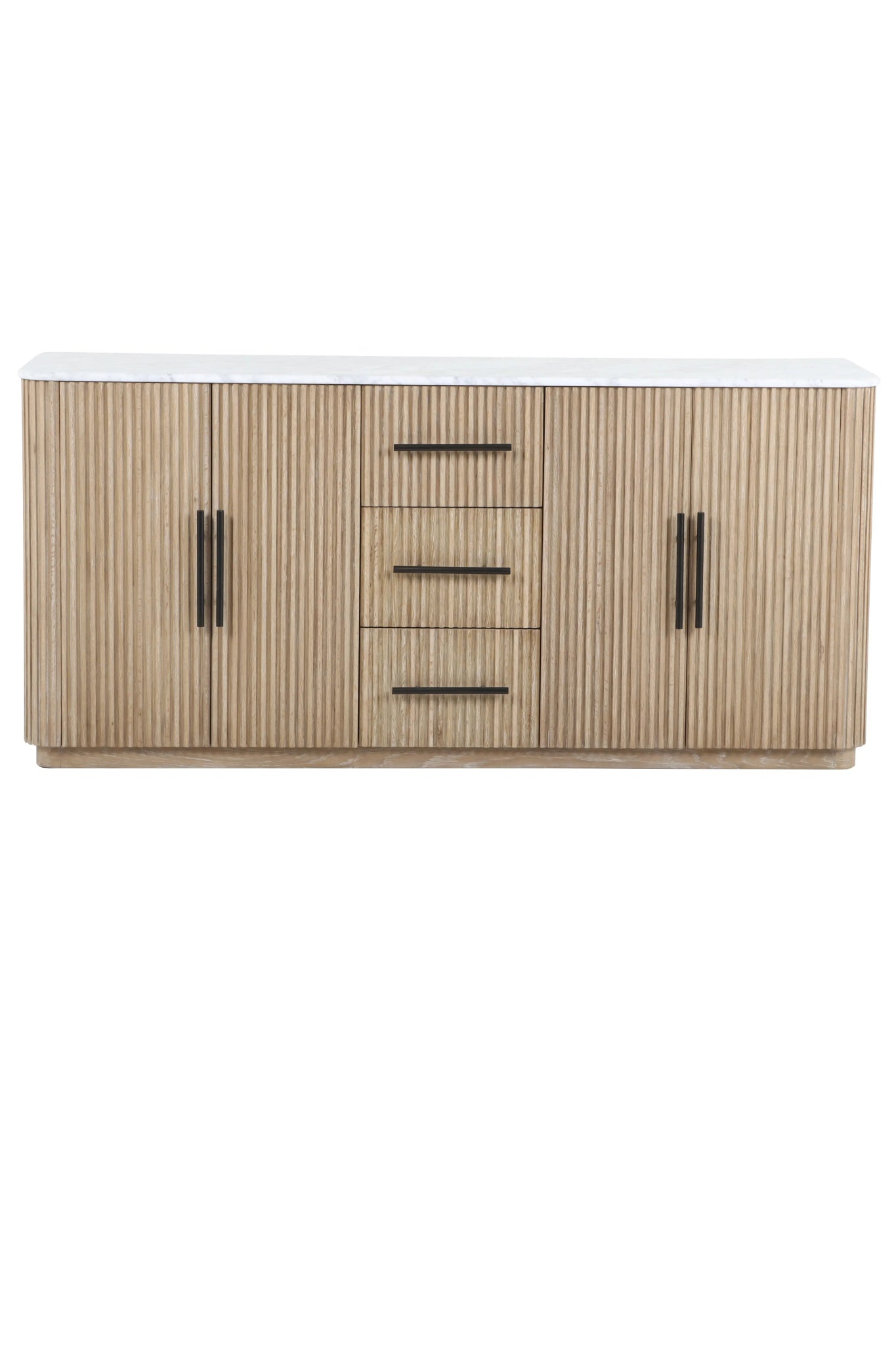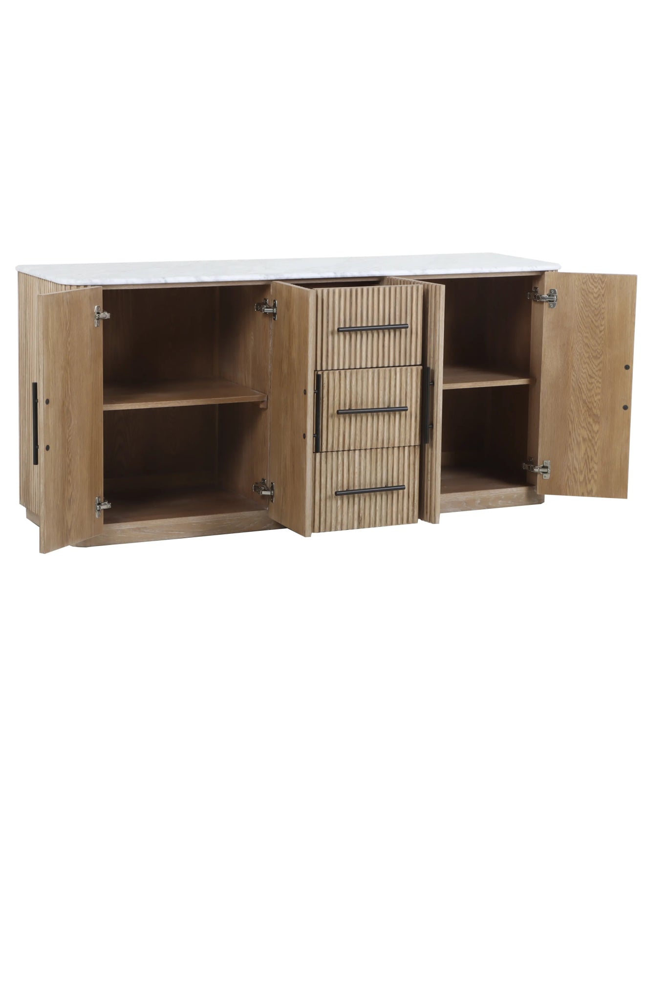 Precioso aparador fabricado en madera de roble natural con 4 estantes laterales y 3 cajones centrales con tapa en mármol.