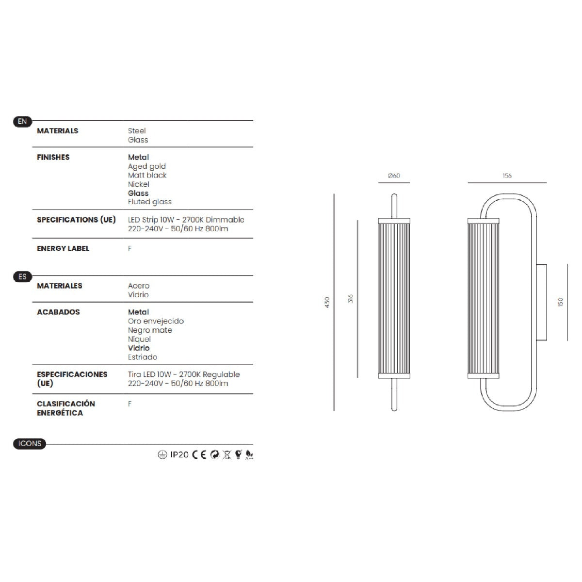- Materiales: Acero y cristal transparente estriado.