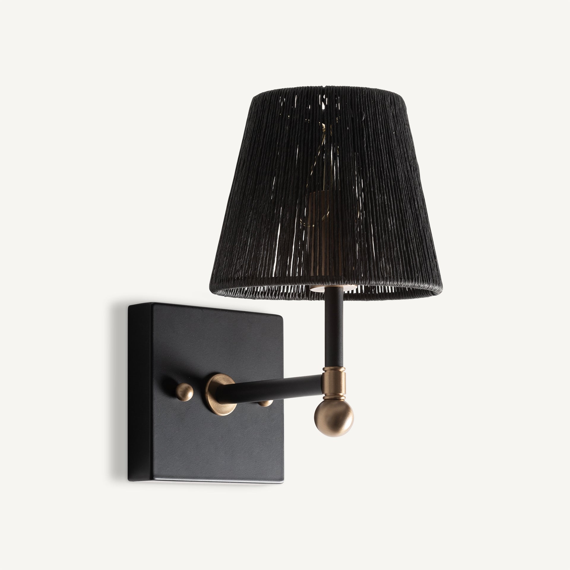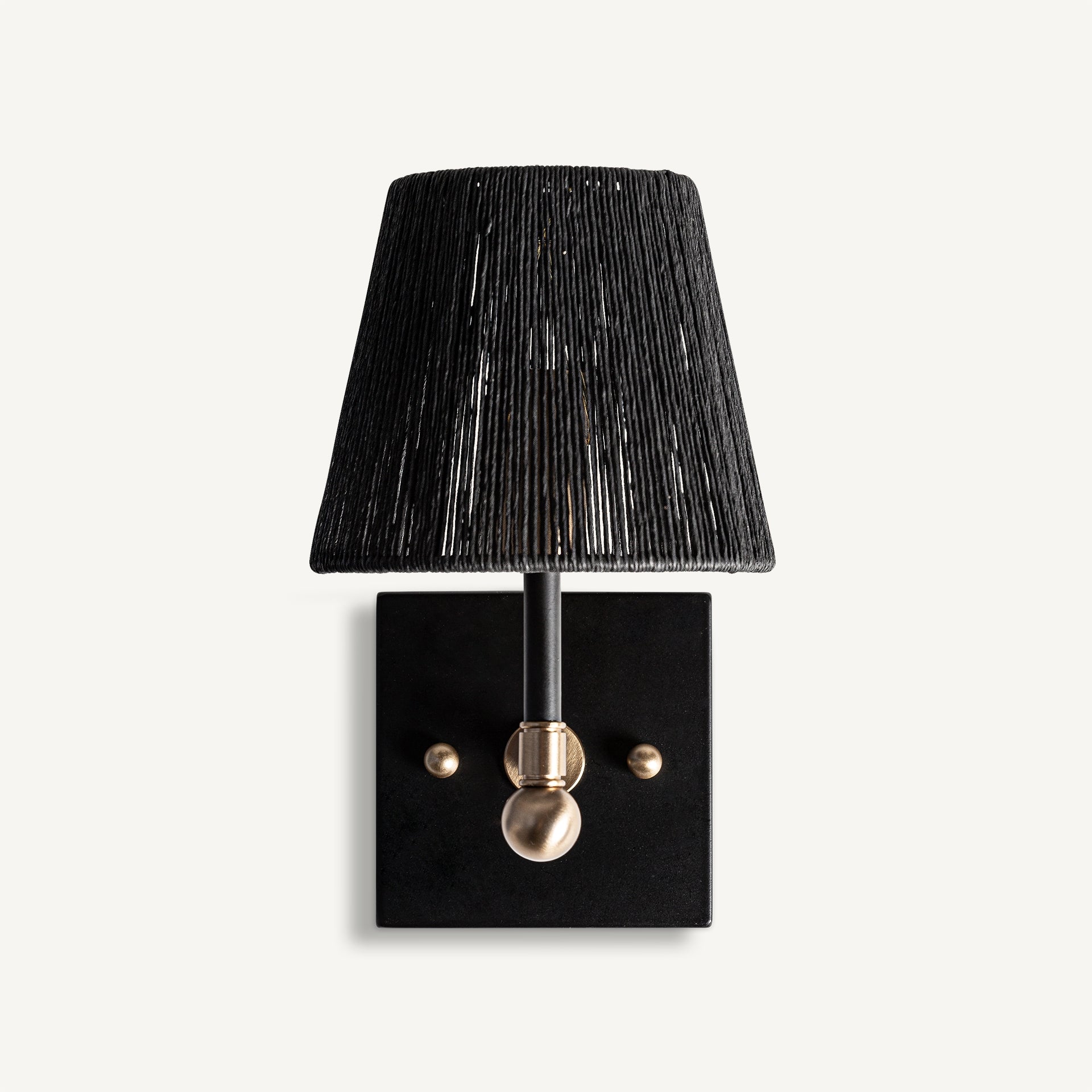 Aplique de pared, en color negro/oro, de estilo art deco. Fabricado en hierro, combinado con pantalla de cuerda.