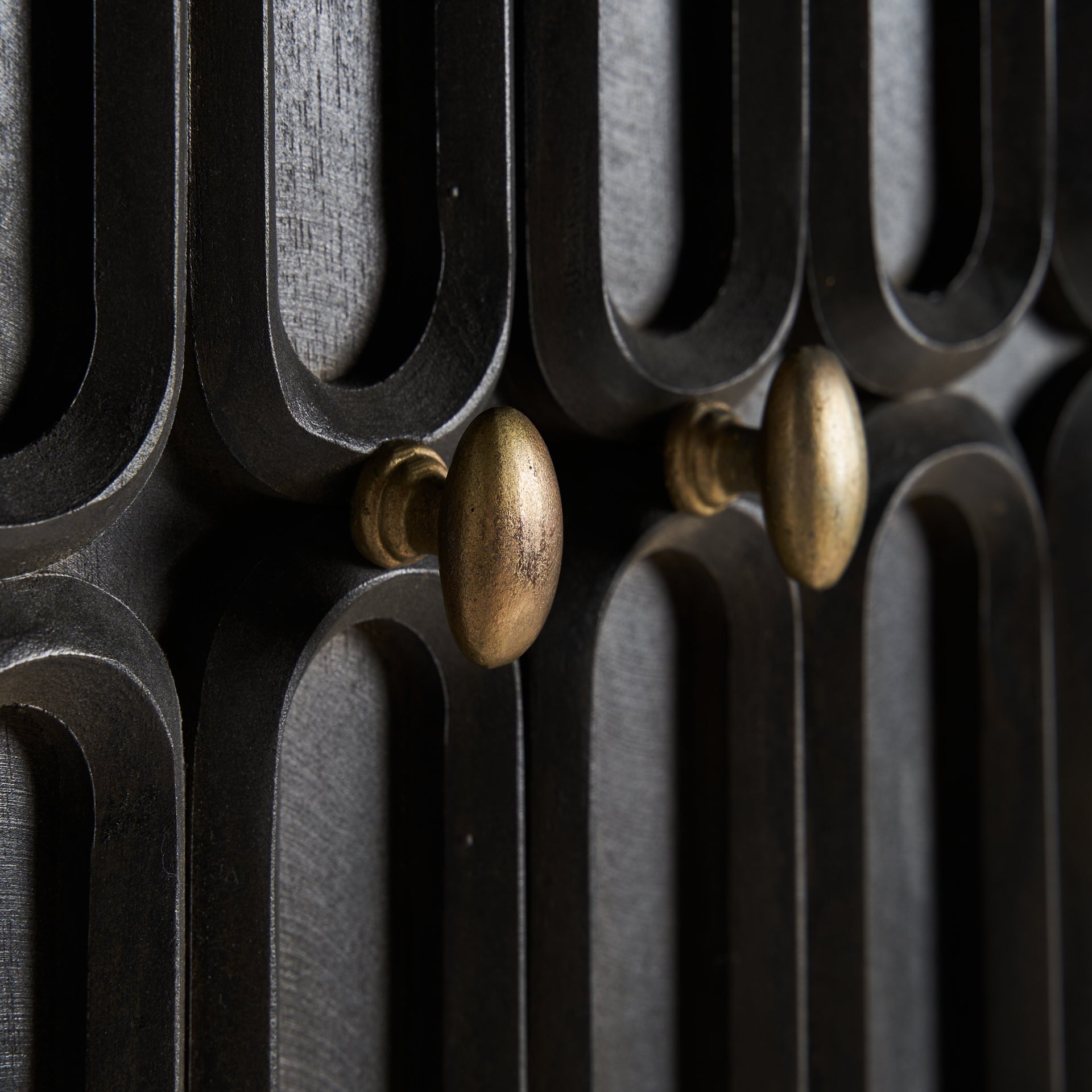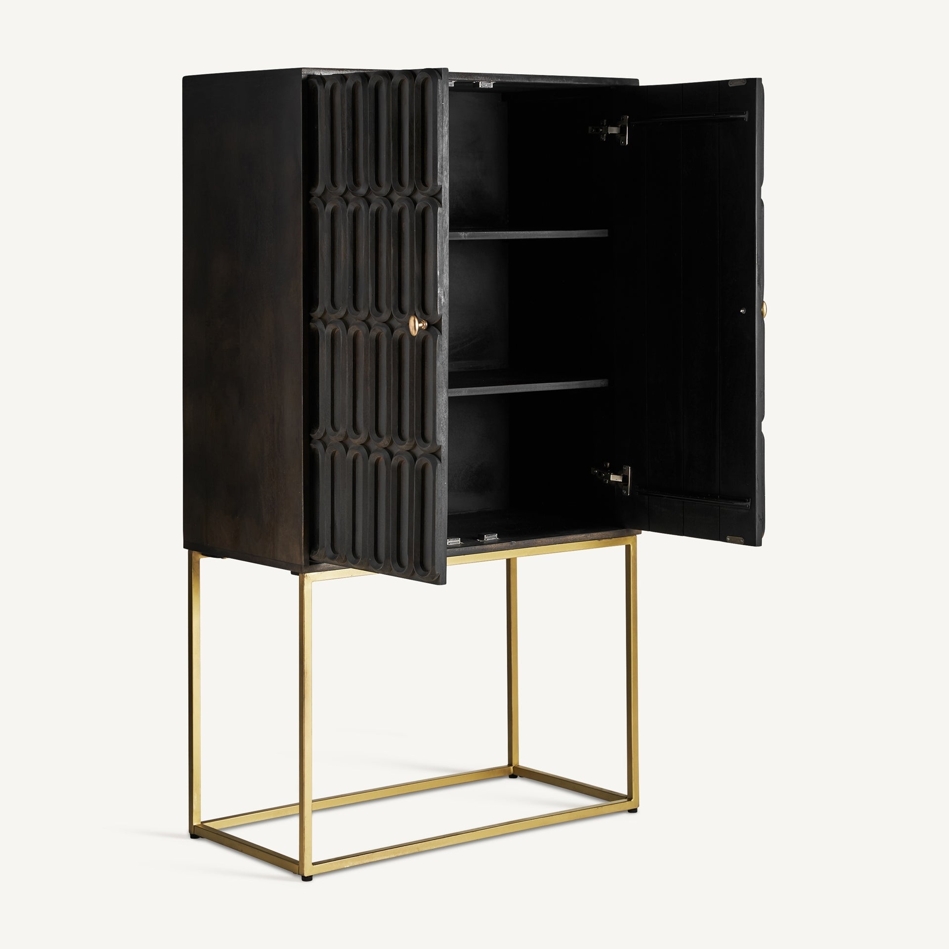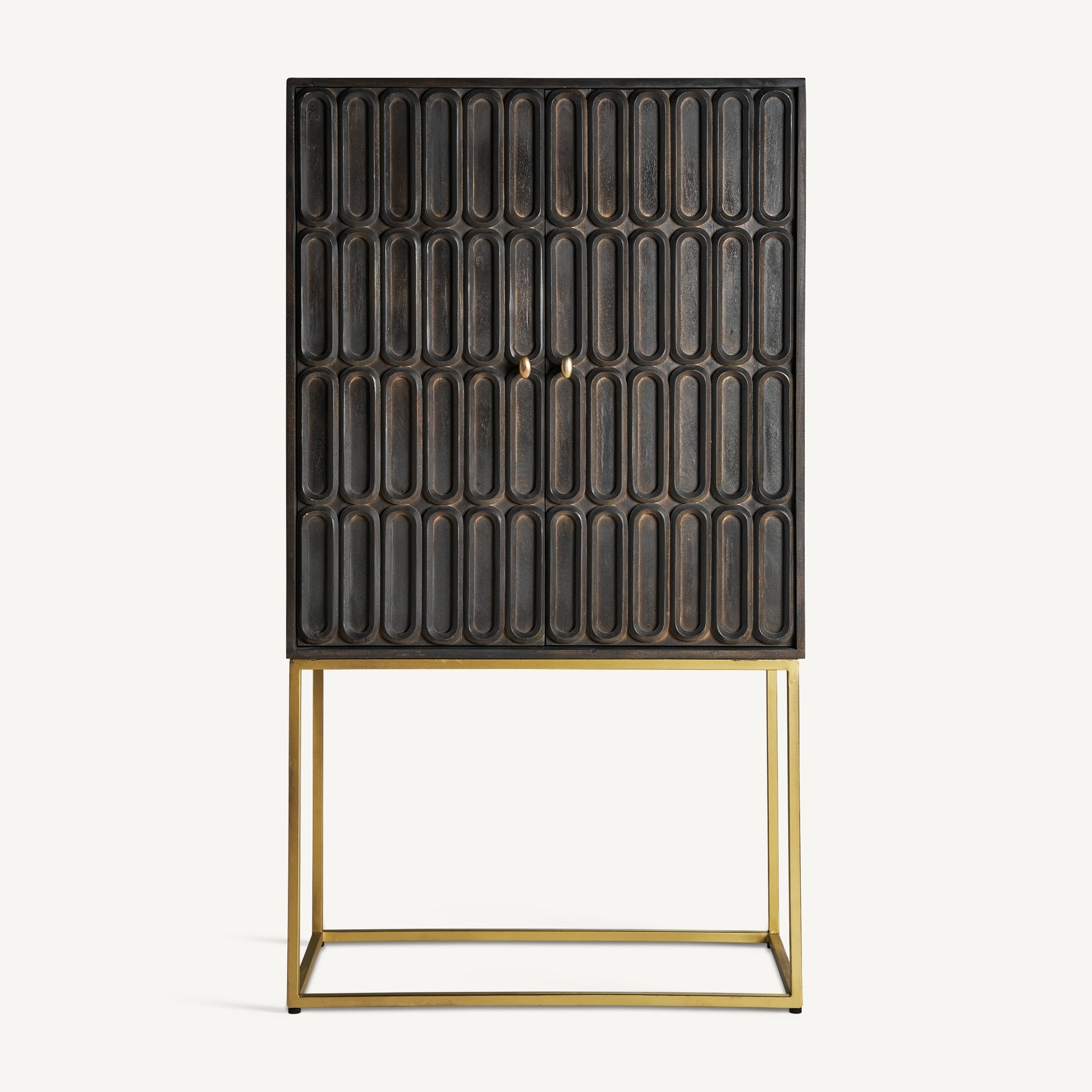 Armario fabricado con madera de mango y detalles de latón en tonos marrón y oro, este armario comedor se puede colocar en el salón, la habitación o el comedor siendo así la solución perfecta para almacenar y mostrar tus piezas más preciadas.