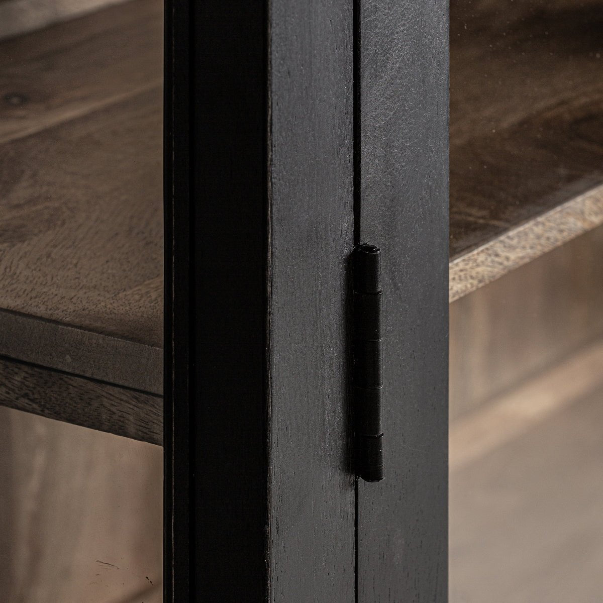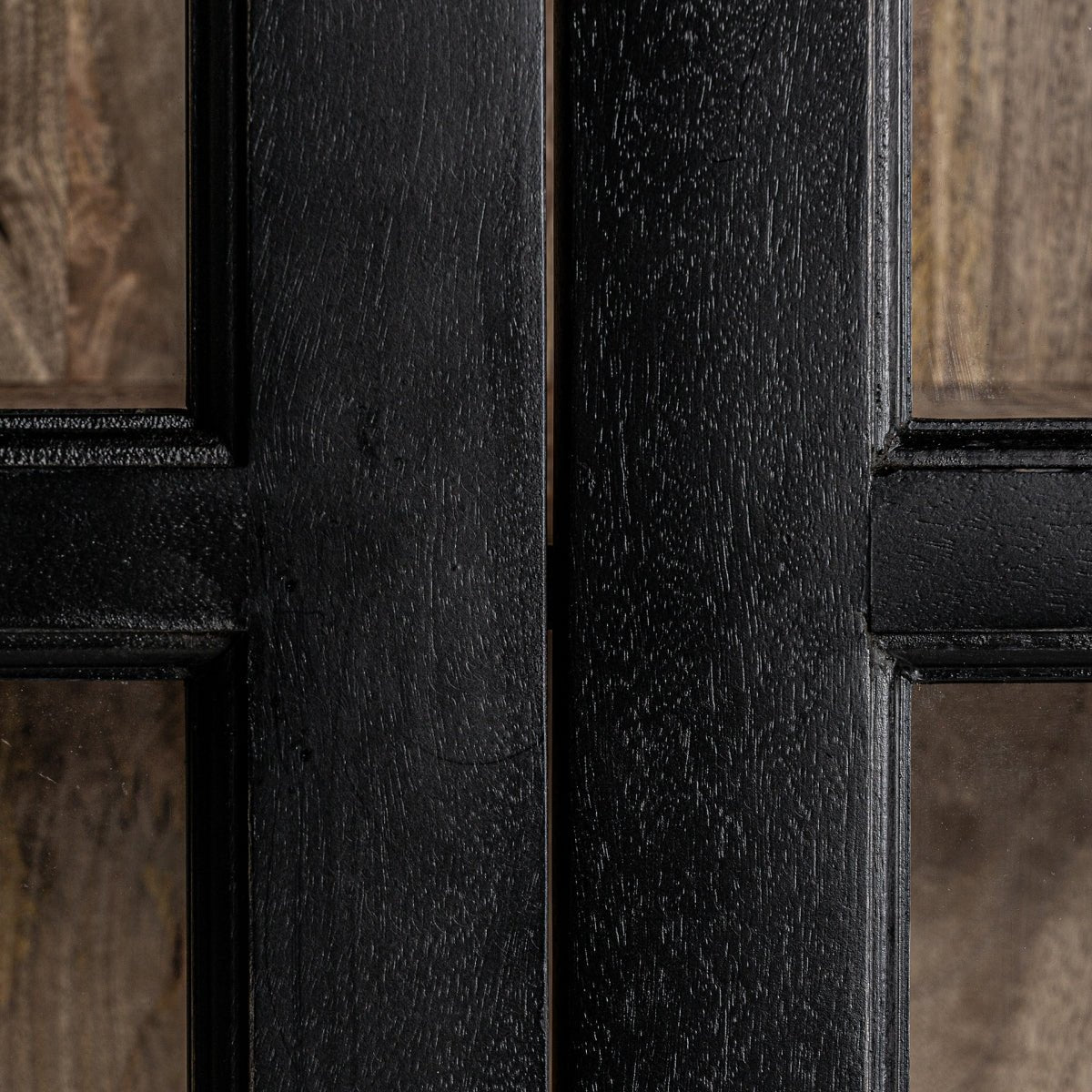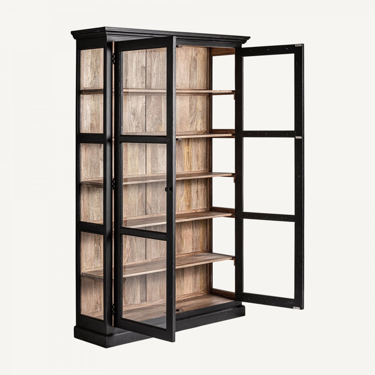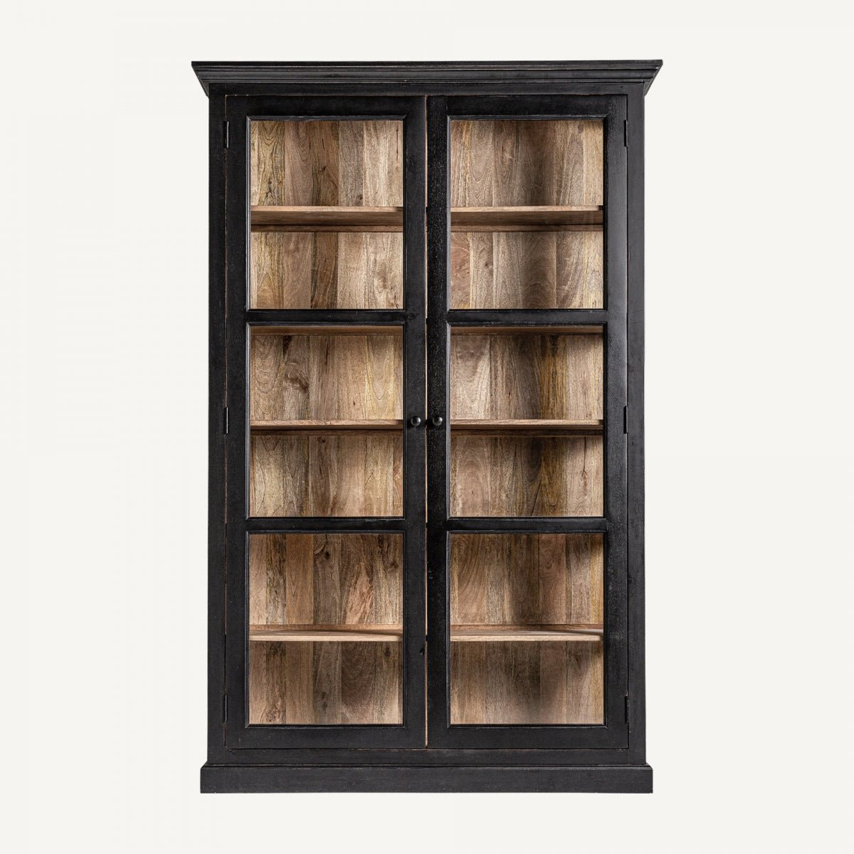 Vitrina en color negro natural de estilo colonial fabricada en madera de mango combinado con vidrio.