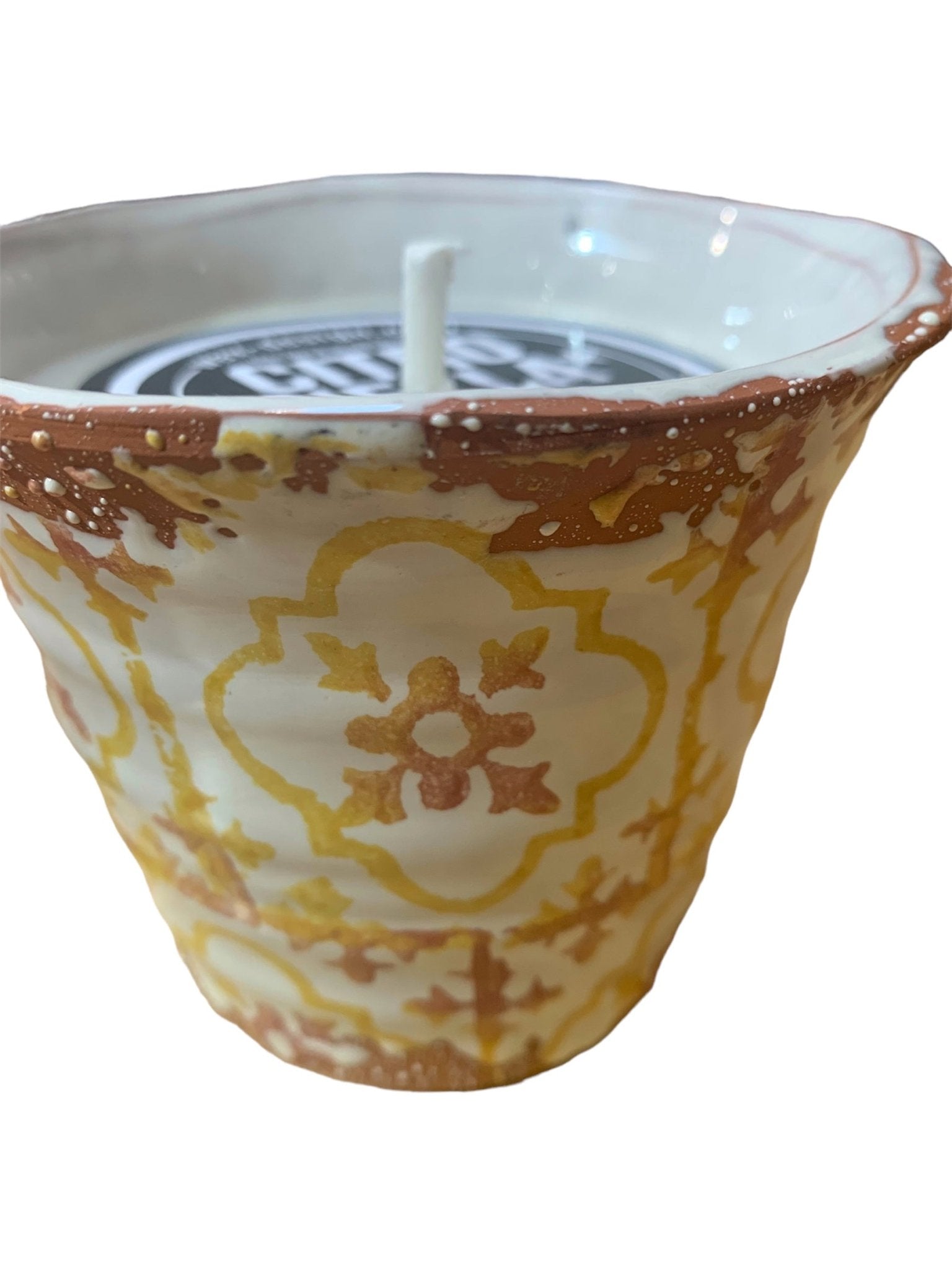 Estupenda vela con envase cerámico de color amarillo, mecha de algodón y fragancia fresca creando un ambiente acogedor.