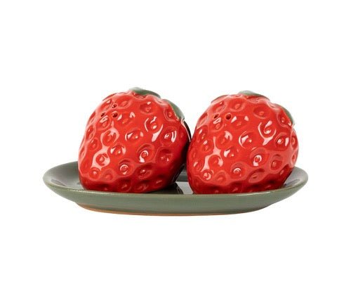 Precioso salero y pimentero con platillo fabricado en cerámica con tonos rojo y verde