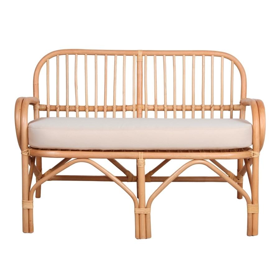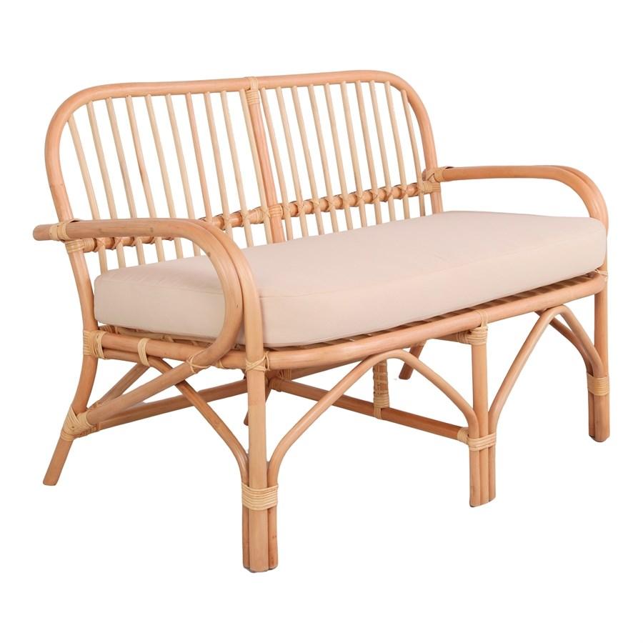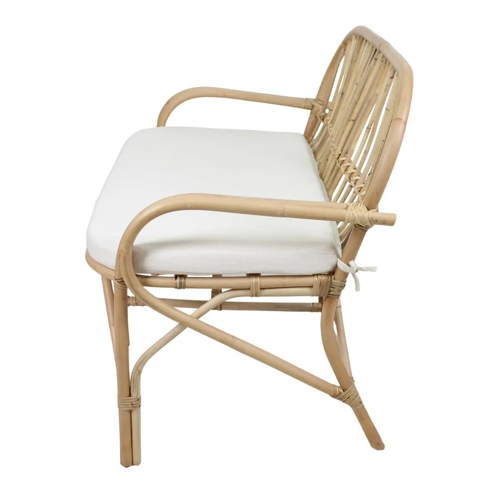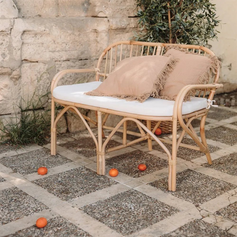 Banco de estilo nórdico - tropical fabricado en bambú y ratán natural. Incluye un cojín tapizado en loneta, y no es apto para exterior. No requiere montaje.