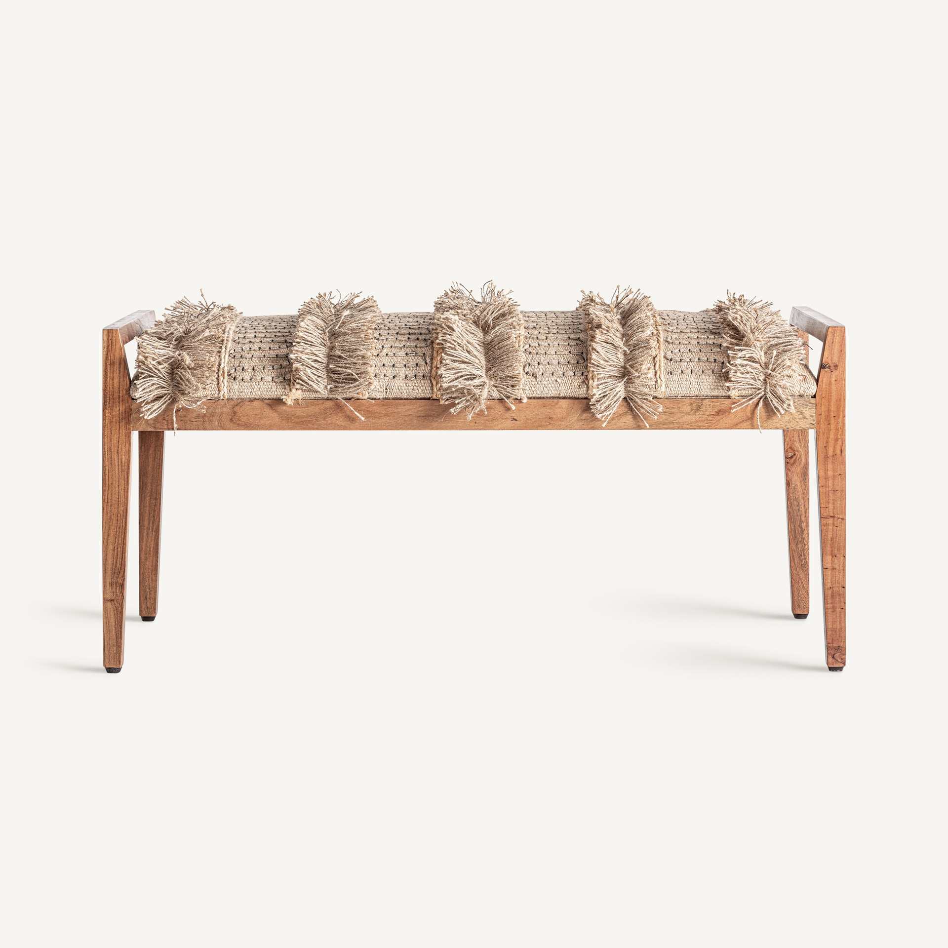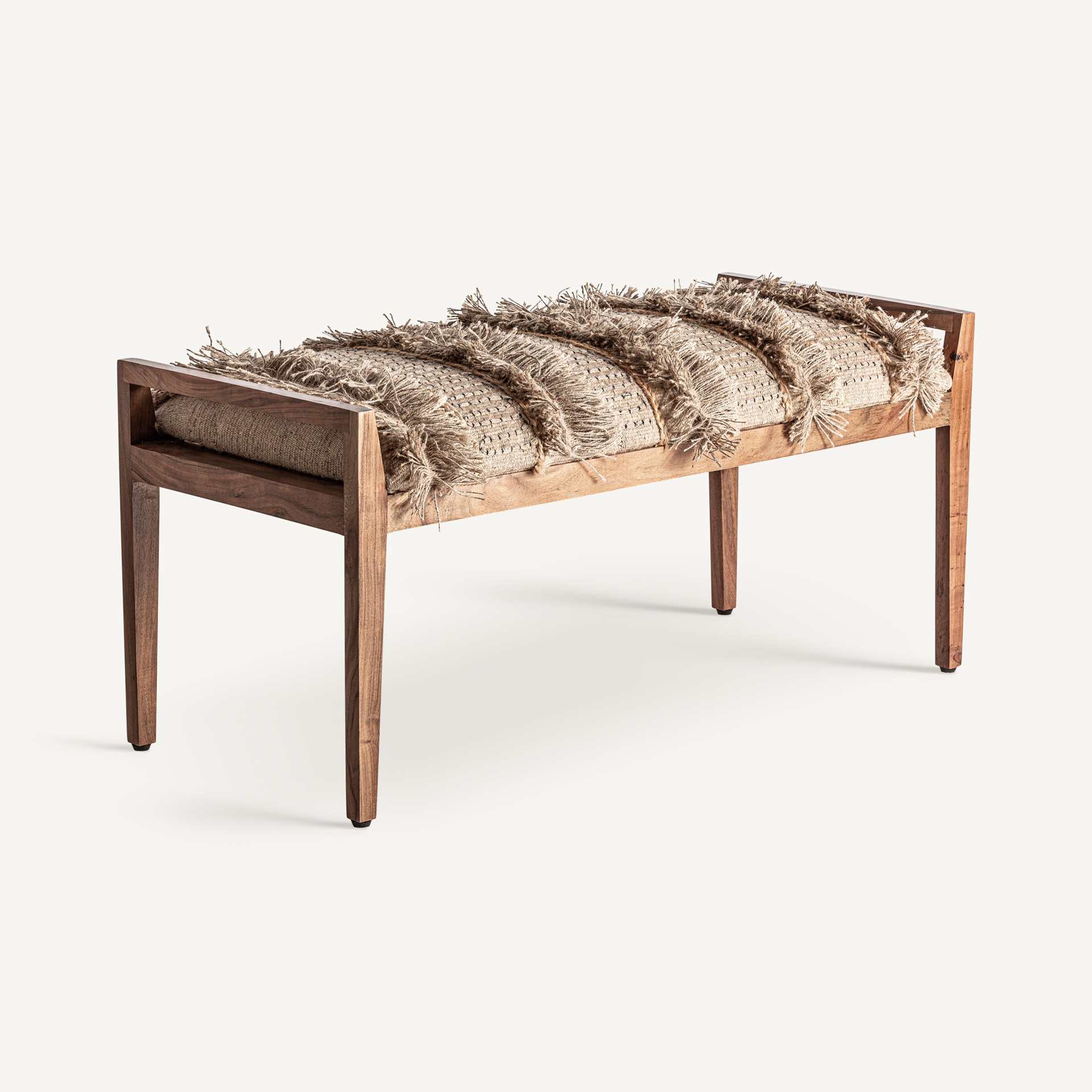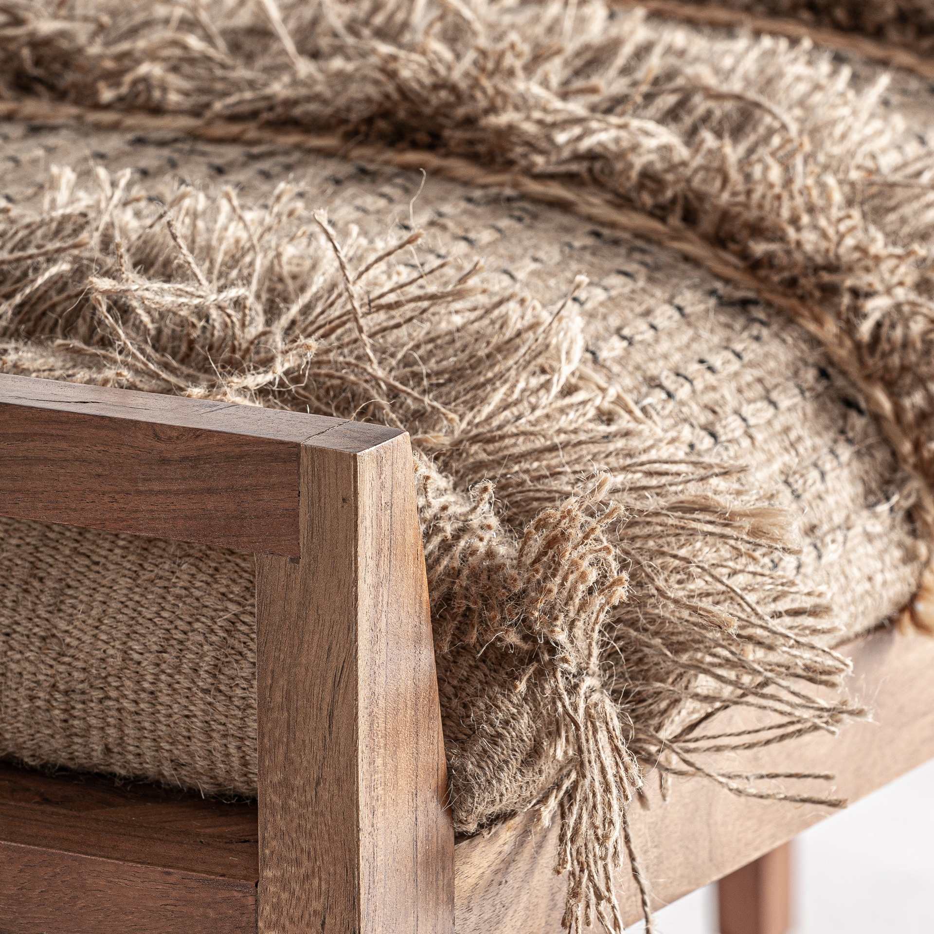 El banco Trival combina el encanto natural del estilo boho con materiales auténticos y texturas acogedoras. Fabricado en madera de mango en tono marrón claro, se complementa con un asiento de algodón en tonos marrones y detalles en yute color beige, creando una pieza cálida, versátil y con mucha personalidad. Perfecto para dar un toque artesanal y relajado a tu salón, dormitorio o recibidor.