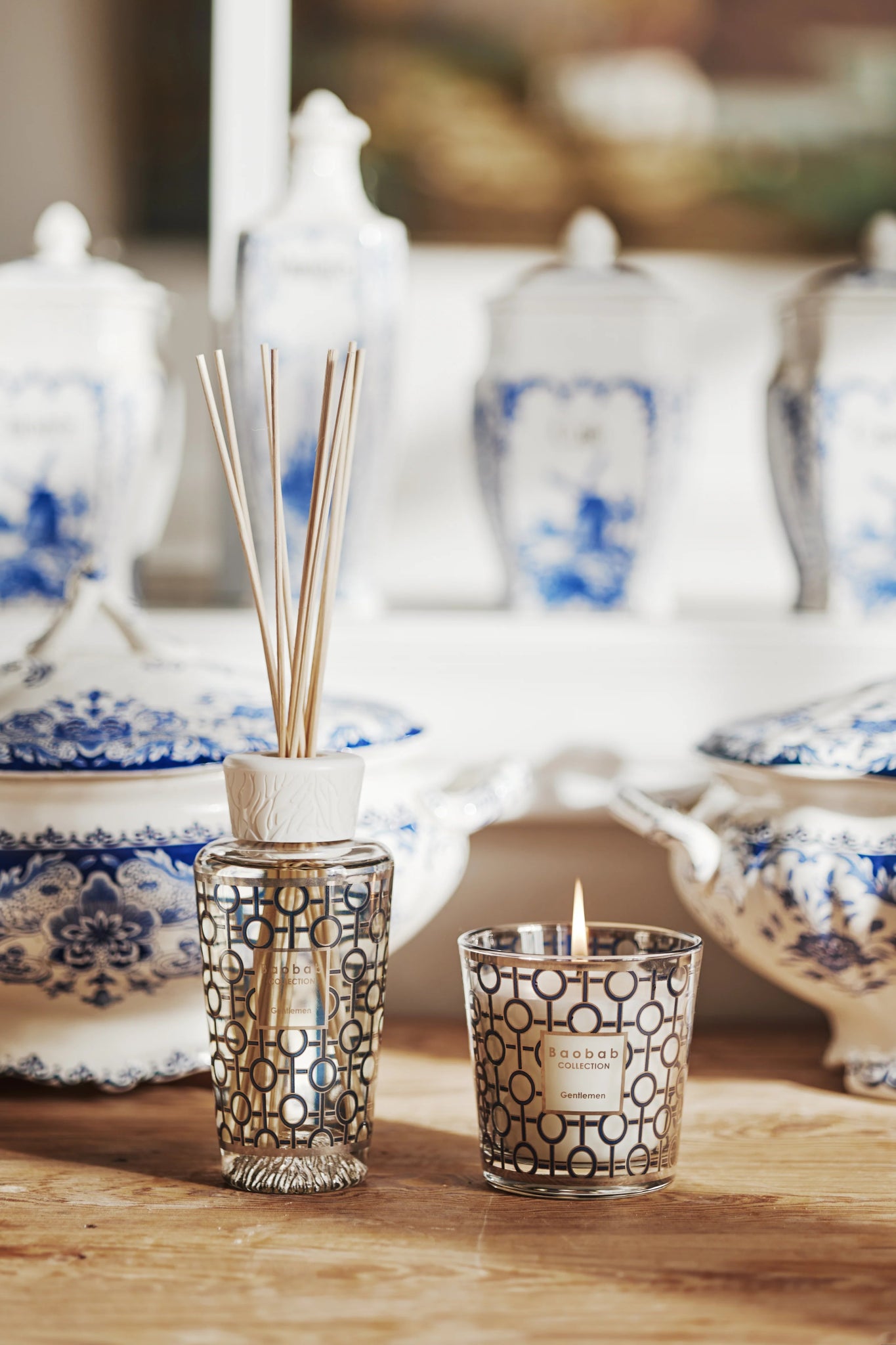 El ambientador en sticks My First Baobab Gentleman ha sido concebido como un verdadero objeto de elegancia masculina. Su recipiente de cristal está decorado con una serigrafía en platino y azul marino, con motivos inspirados en el armario clásico del caballero contemporáneo. El diseño incorpora estampados de seda en tonos sobrios, aportando un aire distinguido, refinado y perfectamente equilibrado.