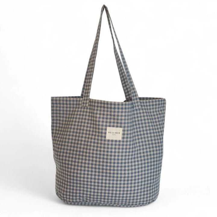 Bolsa shopper grande con asas para llevar al hombro. Con tejido fino de half-panama con estampado a cuadros vichy de color azul. Para su correcto mantenimiento se aconseja lavarlo en frío a mano y no utilizar la secadora.