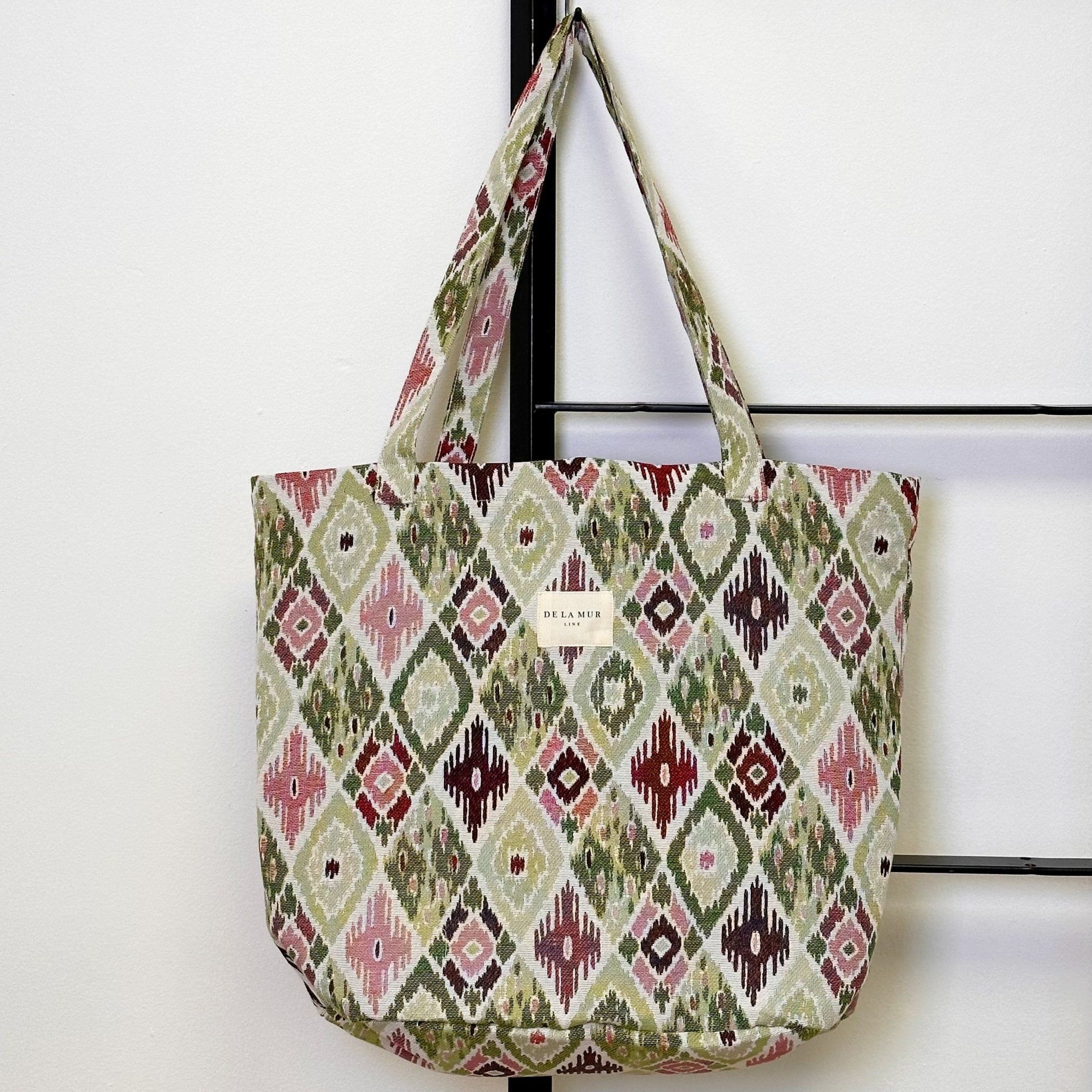 Bolsa shopper grande con asas para llevar al hombro. Con un tejido con estampado geométrico multicolor. Para su correcto mantenimiento se aconseja lavarlo en frío a mano y no utilizar secadora.