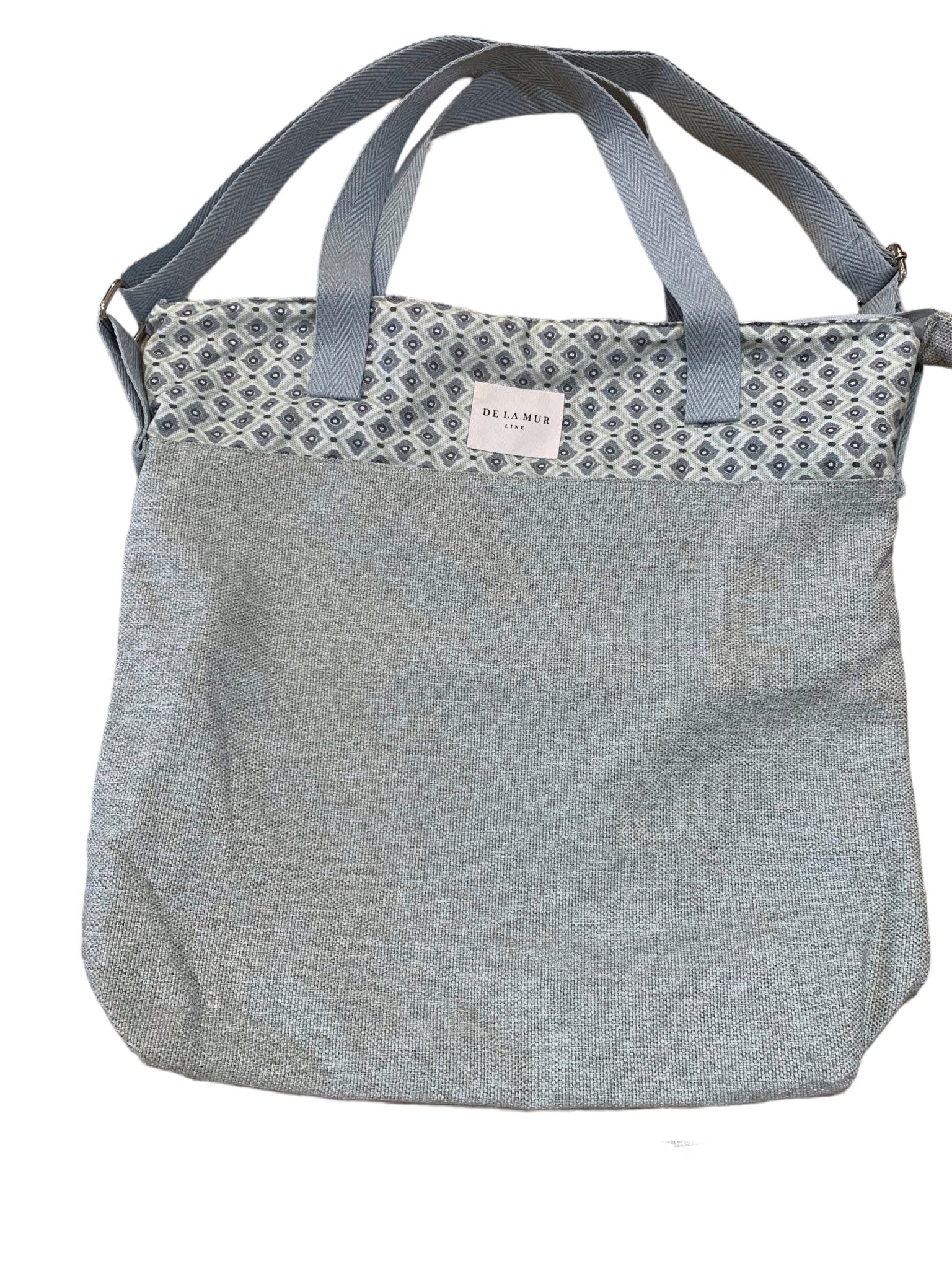 Bolso grande con asa larga ajustable y dos asas medianas en la parte superior. Combinado con dos tejidos diferentes, un tejido con estampado geométrico gris en la parte superior y un tejido liso de color gris en la parte inferior. Opción de llevarlo al hombro o como bandolera. Bolsillo interior con cremallera. Asas de cinta de espiga de algodón de color gris. Para su correcto mantenimiento se aconseja lavarlo en frío y no utilizar secadora.