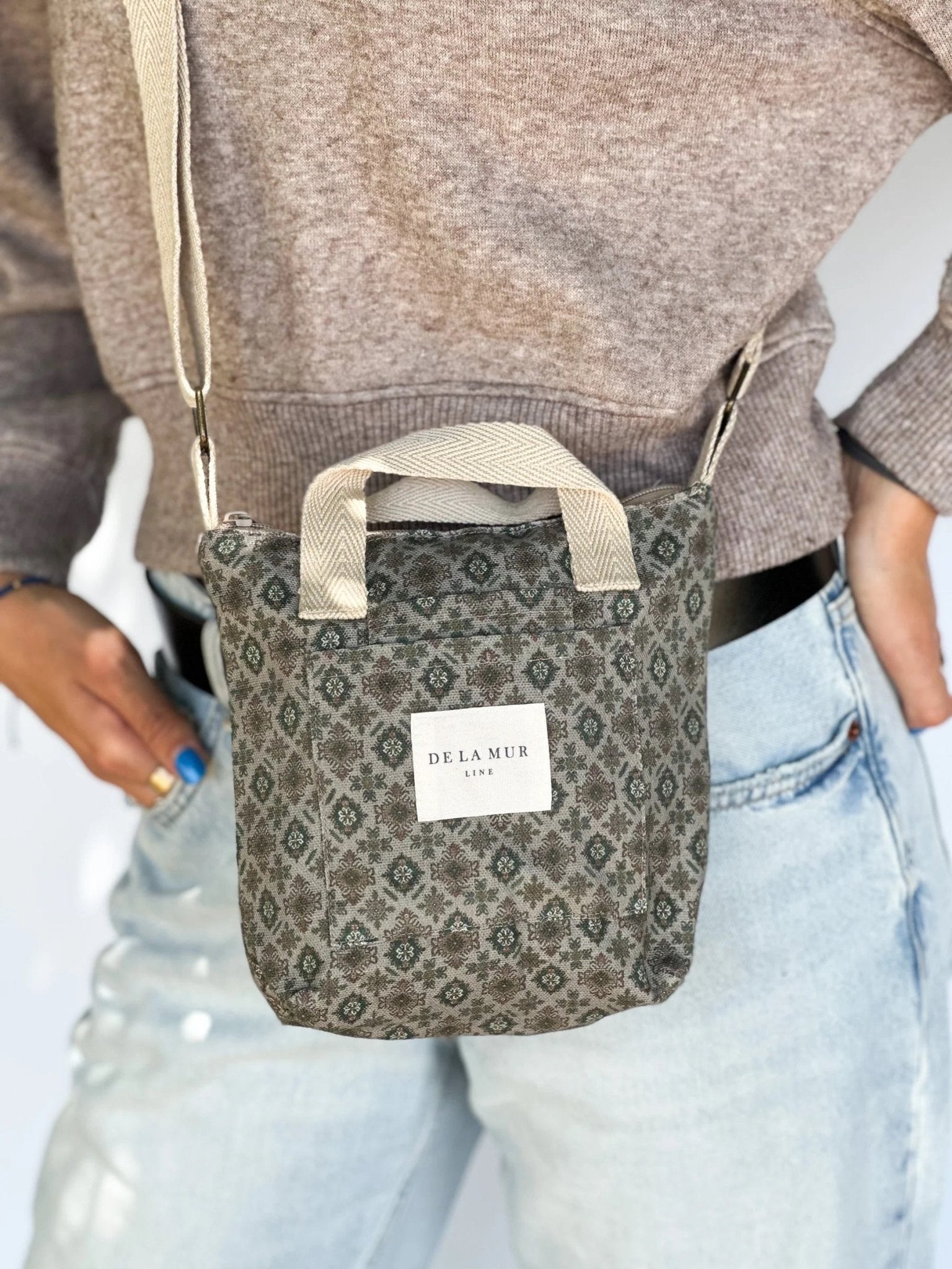 Bolso mini tipo bandolera con asas pequeñas en la parte superior y asa larga ajustable de cinta de espiga de algodón de color beige. Bolsillos sin cremallera en la parte exterior. Con tejido fino con estampado geométrico de color verde caqui. Cierre superior con cremallera. Forrado de tejido grueso de color gris en la parte interior. Bolsillo interior con cremallera. Para su correcto mantenimiento se aconseja lavarlo en frío a mano y no utilizar secadora.