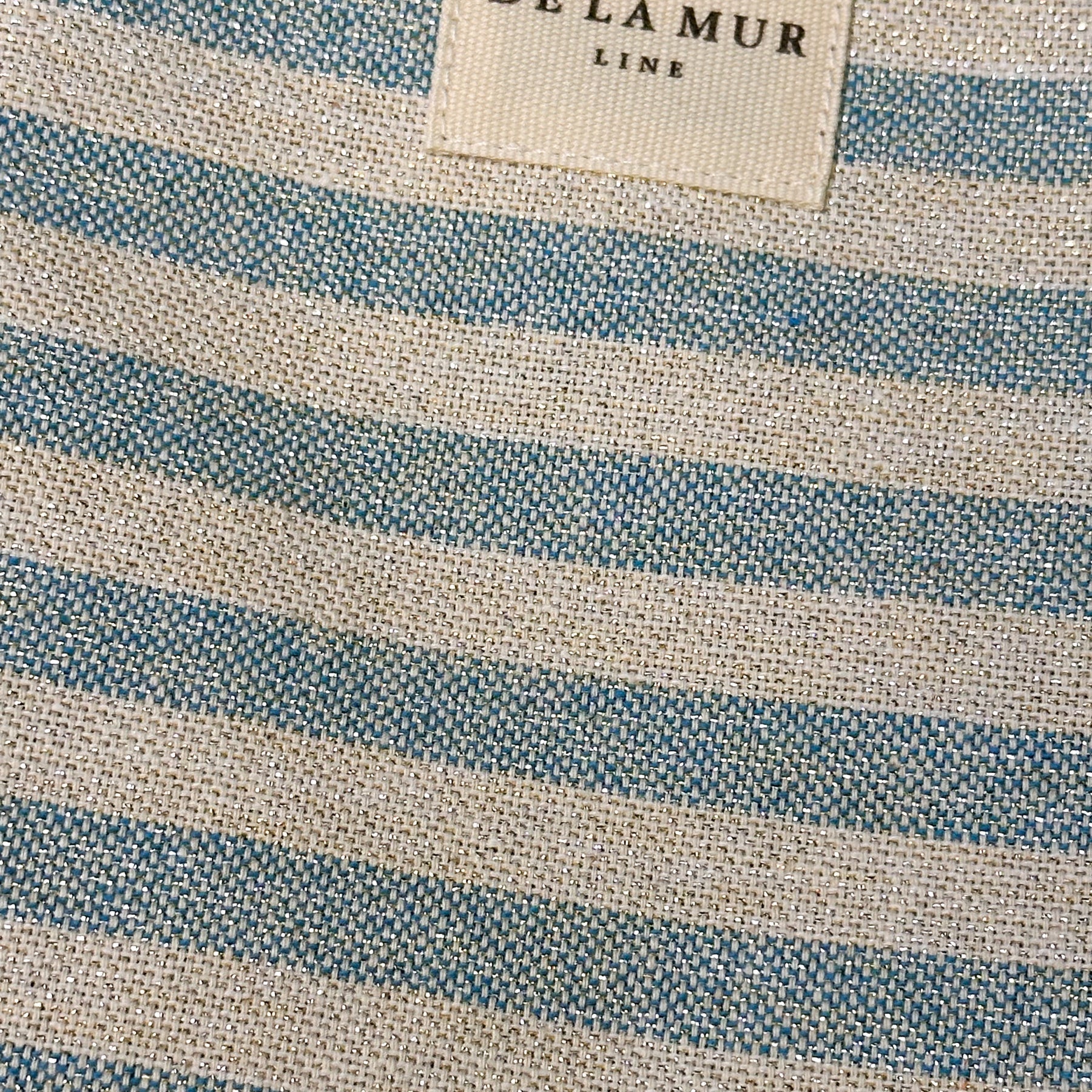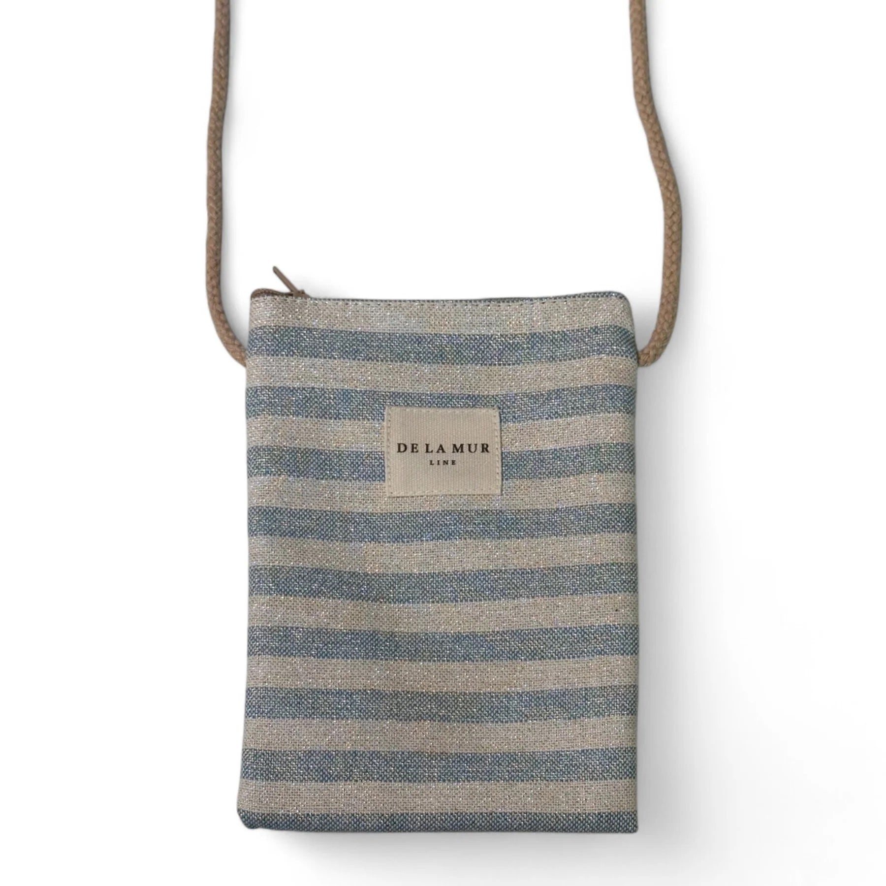 Bolsito porta móvil para llevar tipo bandolera. Con cremallera en la parte superior y cordón largo de algodón de color beige. Con tejido fino de half-panama con estampado a rayas de color crudo y azul con lurex brillante dorado y plateado. Cada articulo puede tener una variación en el estampado, dependiendo de donde se haya efectuado el corte de la pieza. Forrado de tejido grueso de color gris en la parte interior. Para su correcto mantenimiento se aconseja lavarlo en frío a mano y no utilizar secadora.