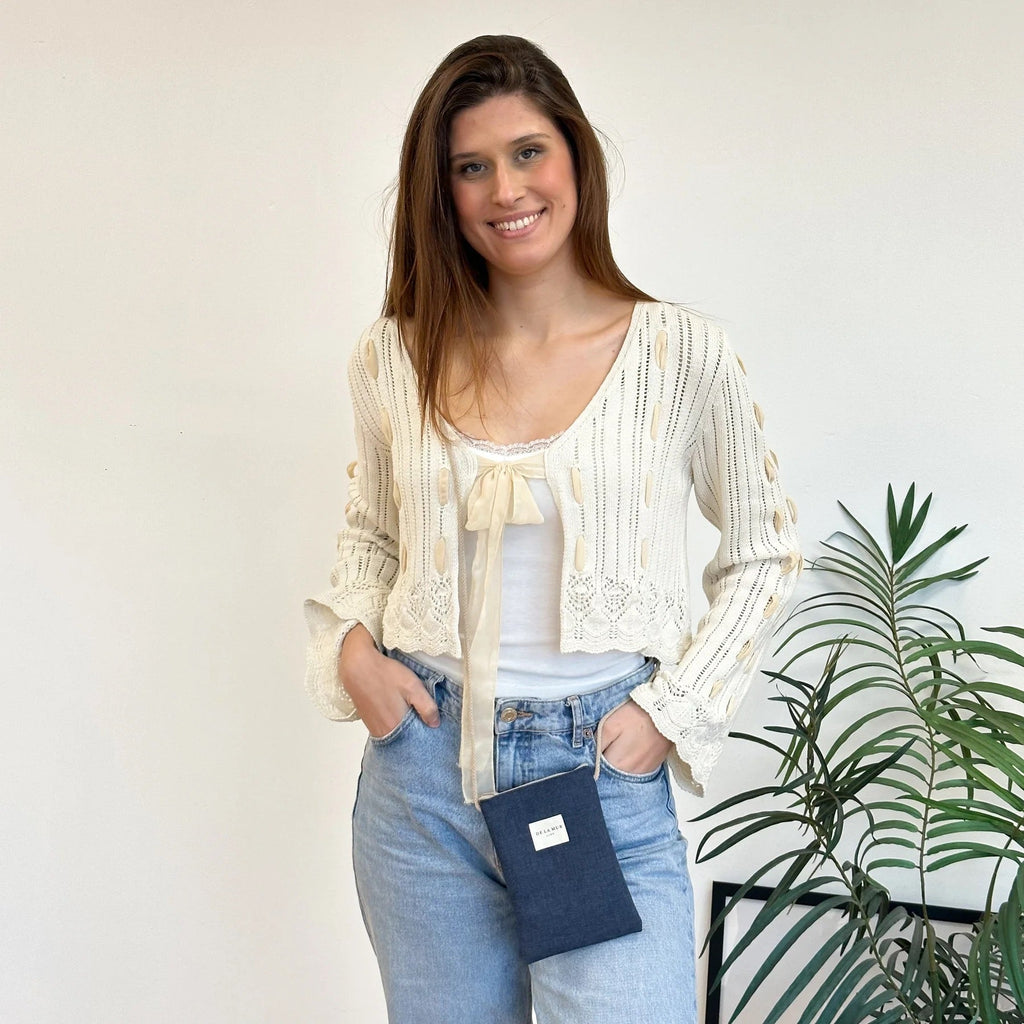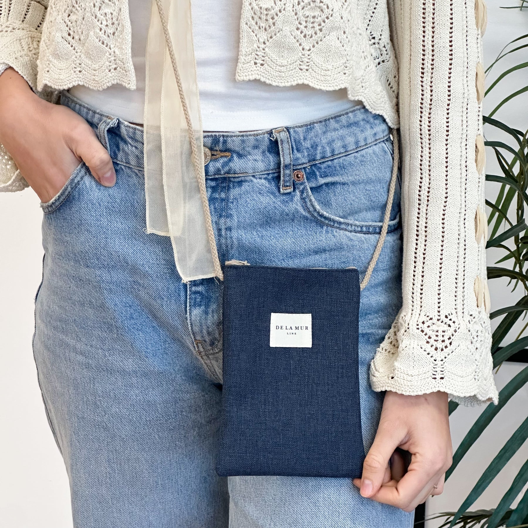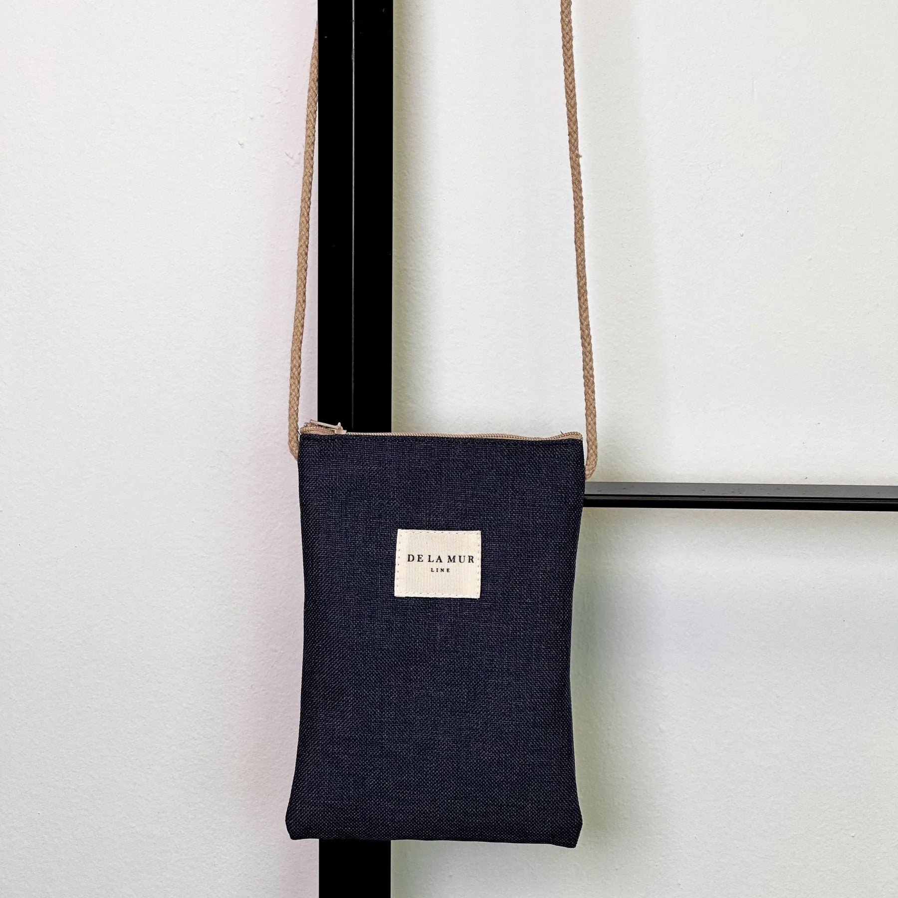 Bolsito porta móvil para llevar tipo bandolera, con cremallera en la parte superior y cordón largo de algodón de color beige. Con tejido liso de color azul marino. Forrado de tejido grueso de color gris en la parte interior. Para su correcto mantenimiento se aconseja lavarlo en frío a mano y no utilizar secadora.