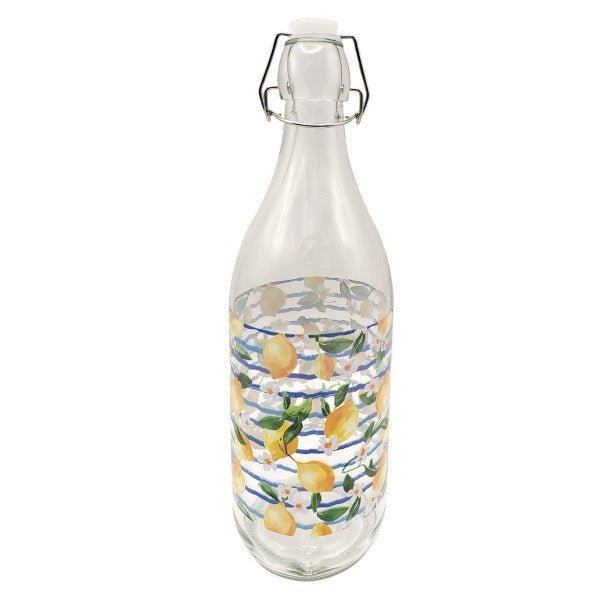 Botella con tapón fabricada en vidrio transparente con motivos de limones.