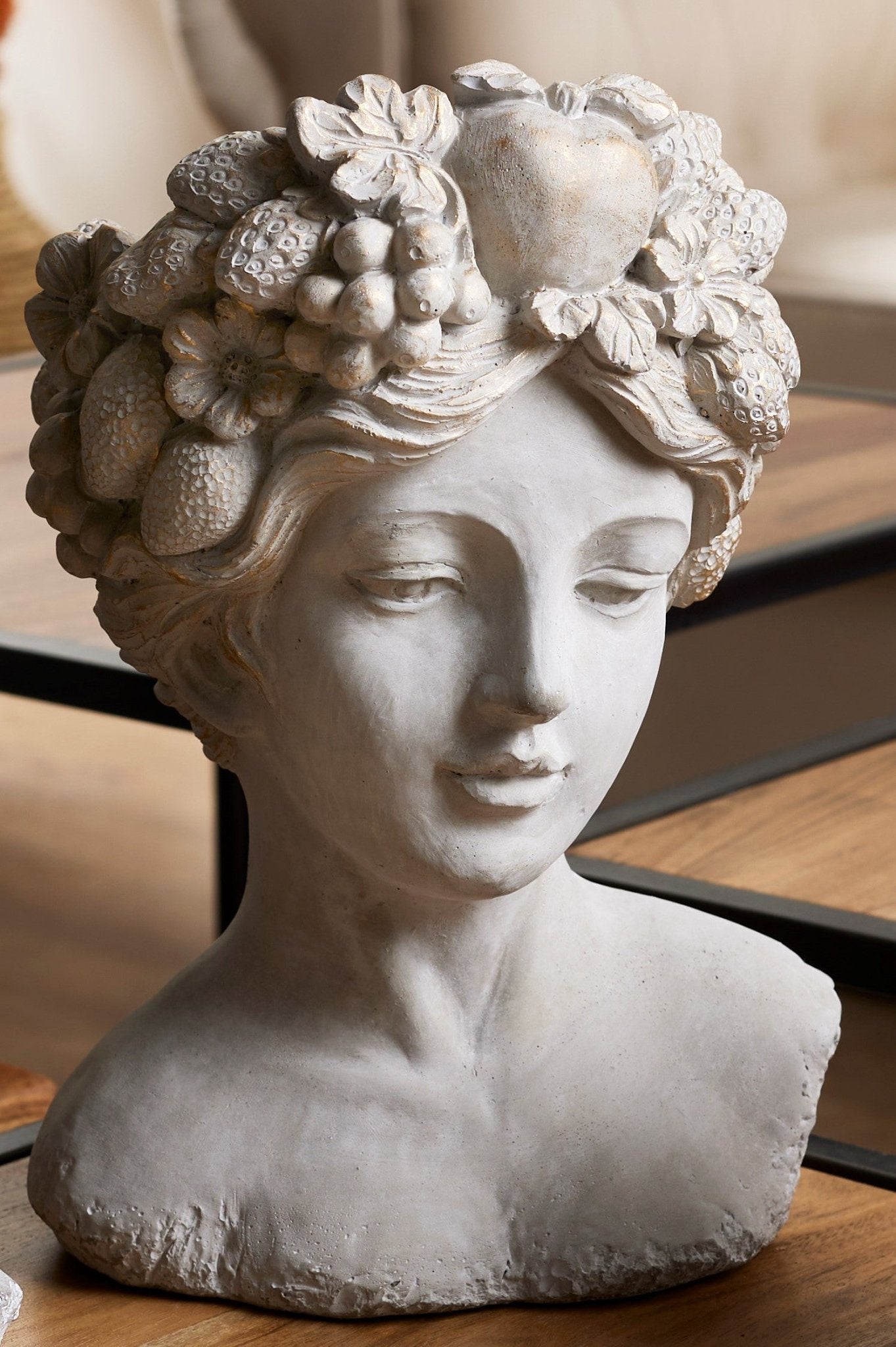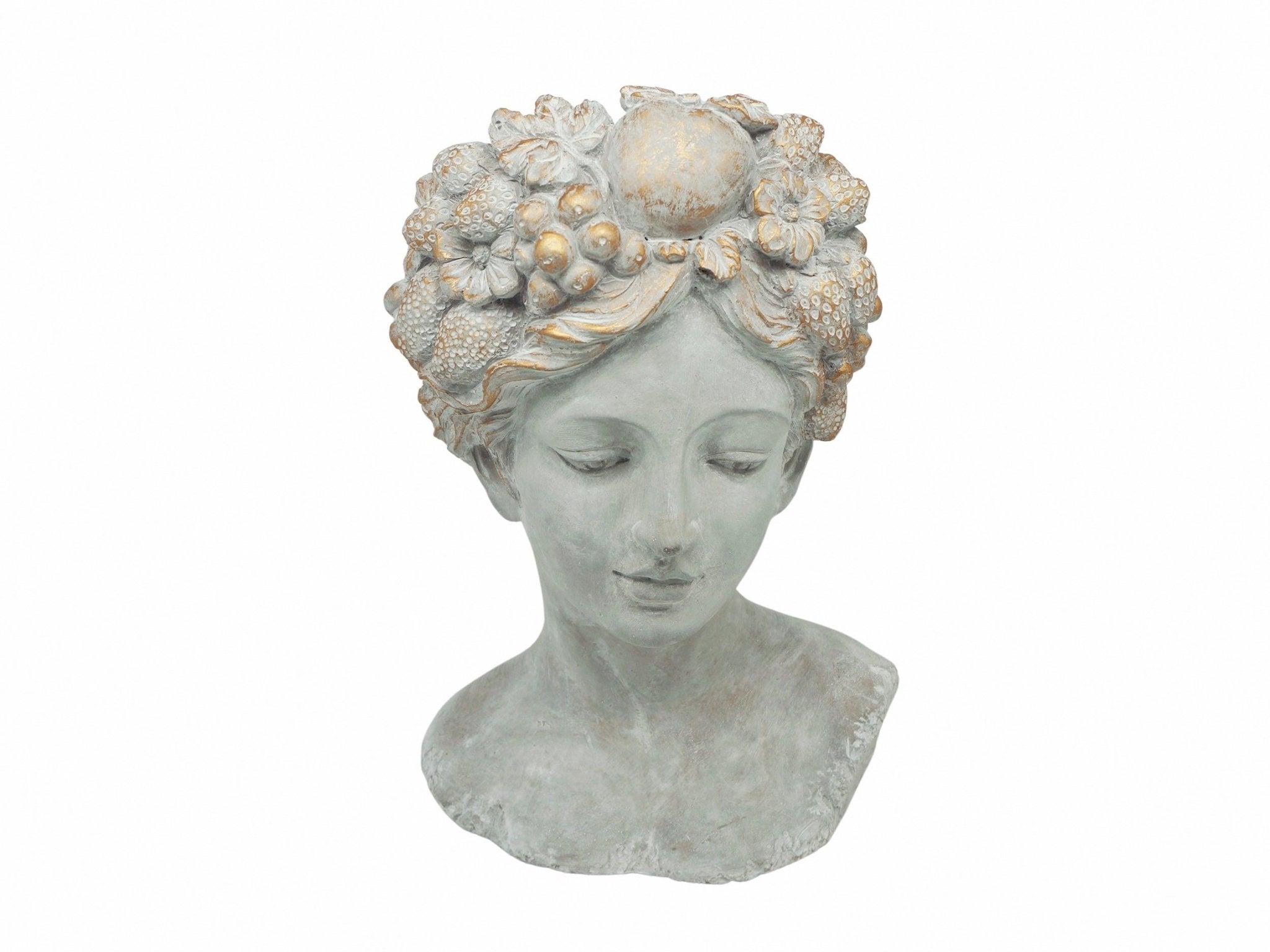 Original busto de una mujer con tocado de frutas dorado fabricado en cemento de color gris. Sirve como maceta puesto que en la parte superior dispone de un hueco donde poder colocar una planta.