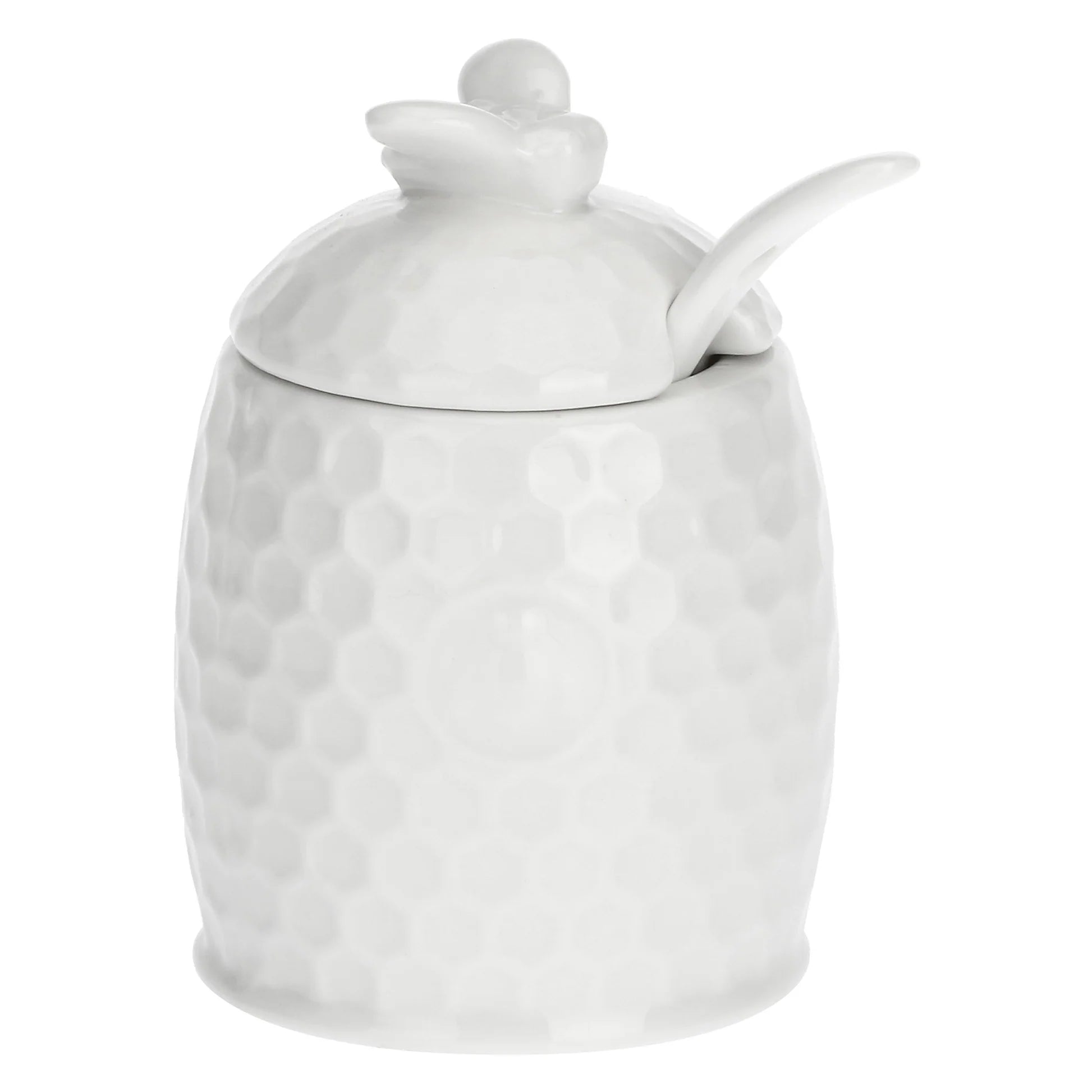 Azucarero fabricado en porcelana de alta calidad, concebido para integrarse en la línea de desayuno y accesorios. Su superficie presenta un diseño táctil en relieve de panal, que aporta carácter y un acabado distintivo sin renunciar a la sobriedad y la elegancia funcional.