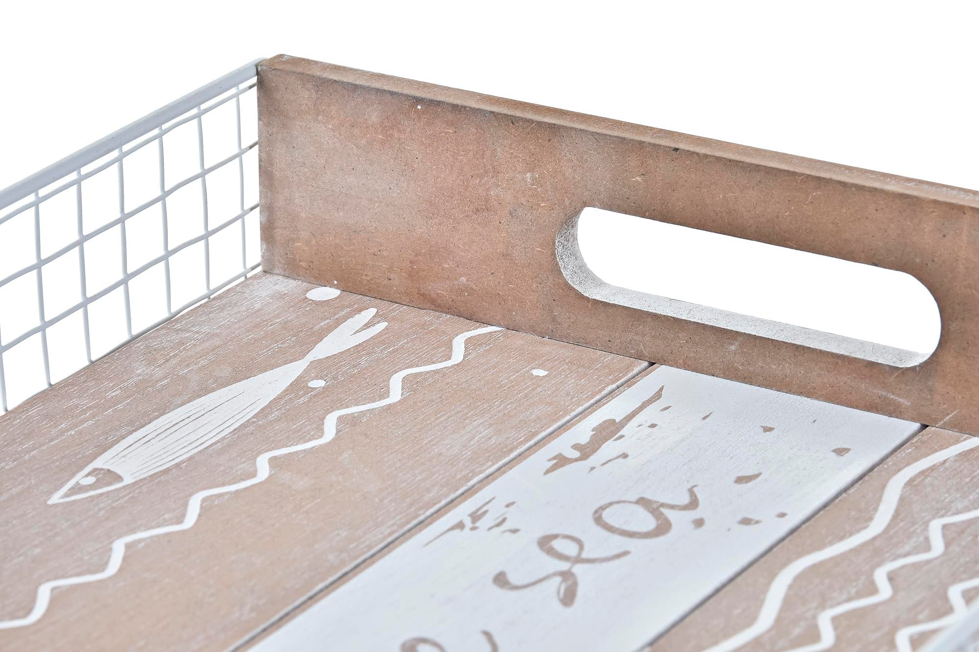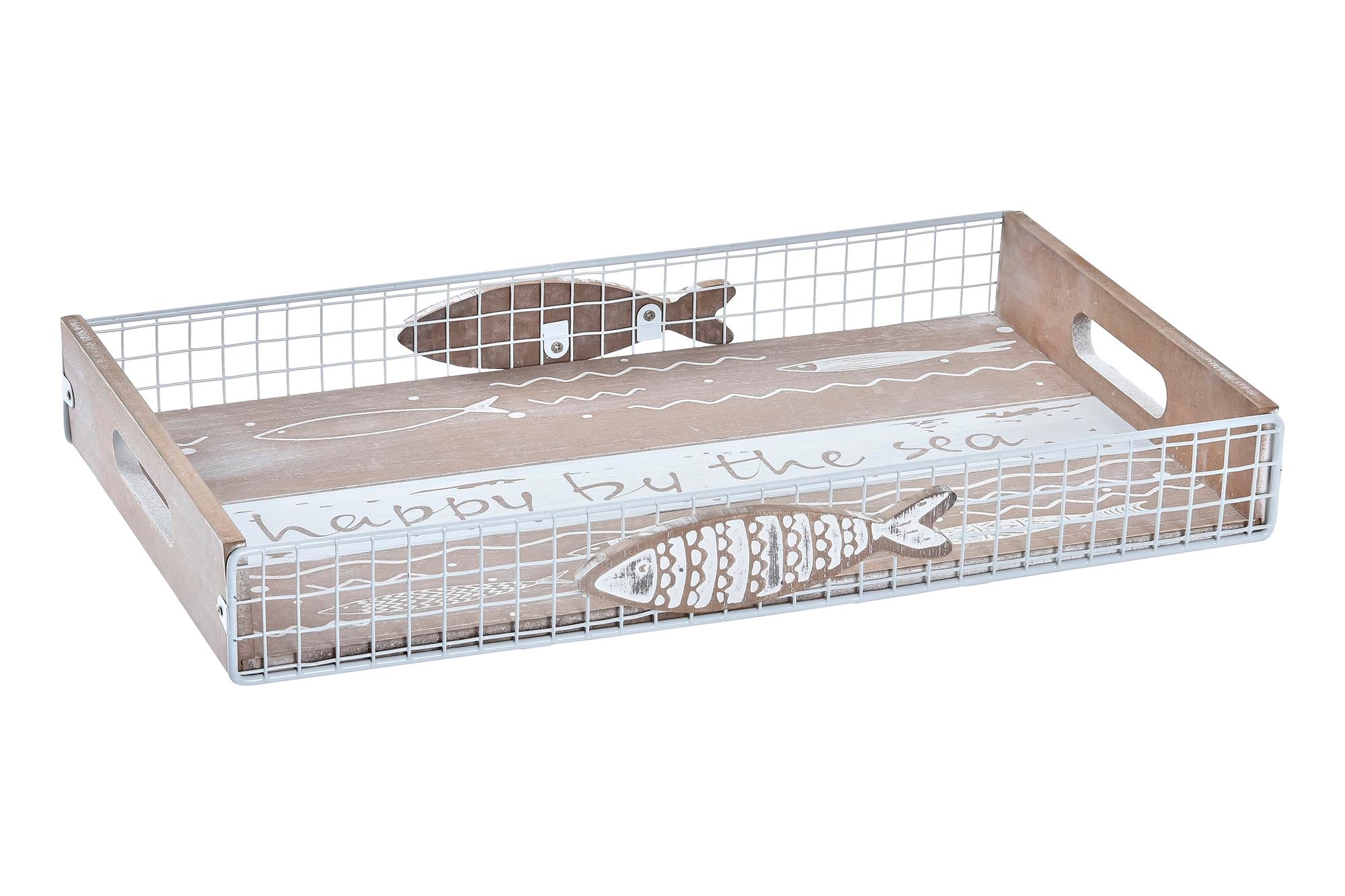Preciosa bandeja con carácter mediterráneo en colores natural y blanco fabricada en madera y metal.