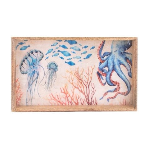 Añade un toque marino y artístico a tu decoración con estas preciosas bandejas rectangulares fabricadas en madera natural. En su interior, una ilustración multicolor de medusas, peces y un pulpo entre corales evoca la belleza del fondo del mar con estilo y delicadeza.