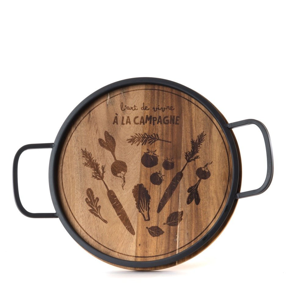 Esta bandeja redonda combina la calidez de la madera de acacia natural con la resistencia del hierro en color negro, creando una pieza funcional y decorativa. Sus asas metálicas aportan un toque industrial, mientras que los delicados dibujos de vegetales evocan una estética orgánica y artesanal. Ideal para servir, decorar o dar carácter a cualquier rincón de la cocina o el comedor.