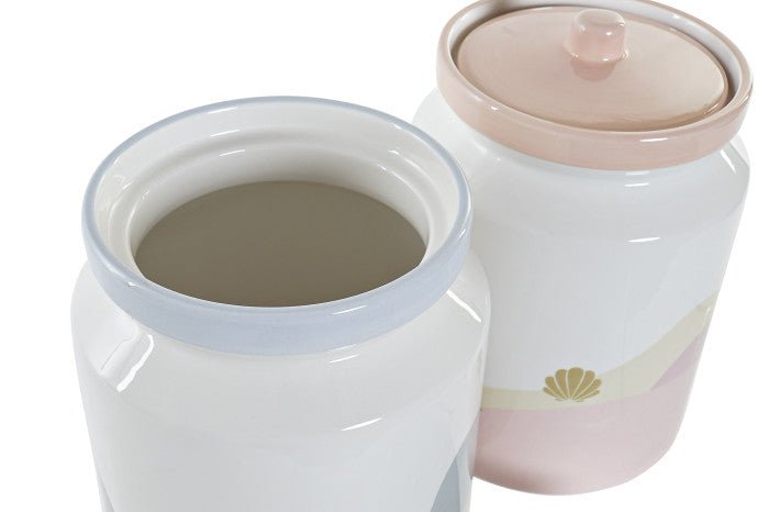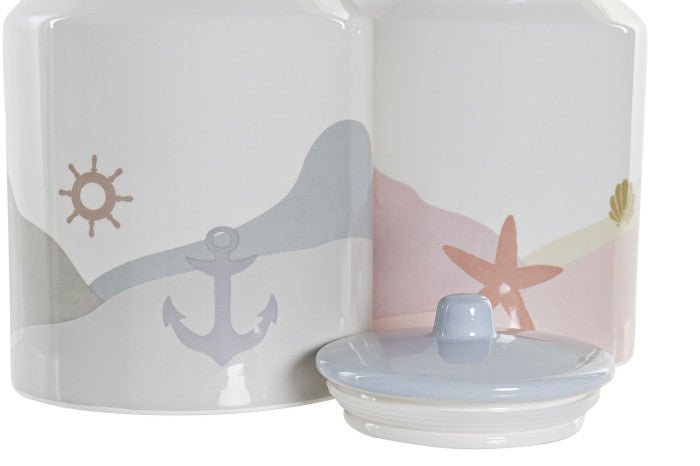 Estos encantadores botes de cocina de cerámica aportan un toque fresco y costero a cualquier espacio. Cada uno presenta un diseño delicado y decorativo: en uno destaca una ancla y en el otro una estrella de mar, ambos símbolos del mundo marino que evocan calma, naturaleza. Estos botes no solo son funcionales para almacenar ingredientes secos, como azúcar, café o sal, sino que también se convierten en piezas decorativas que embellecen la cocina con un estilo náutico.