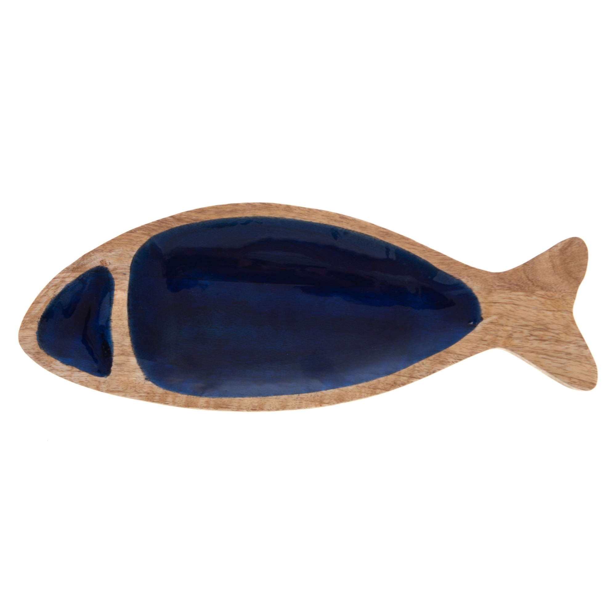 Precioso plato de aperitivo en forma de pez fabricado en madera de mango color natural e interior de color azul.