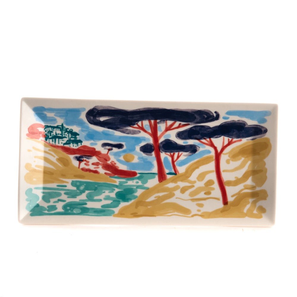 Precioso plato de aperitivo rectangular con dibujo de un pueblo y paisaje multicolor.