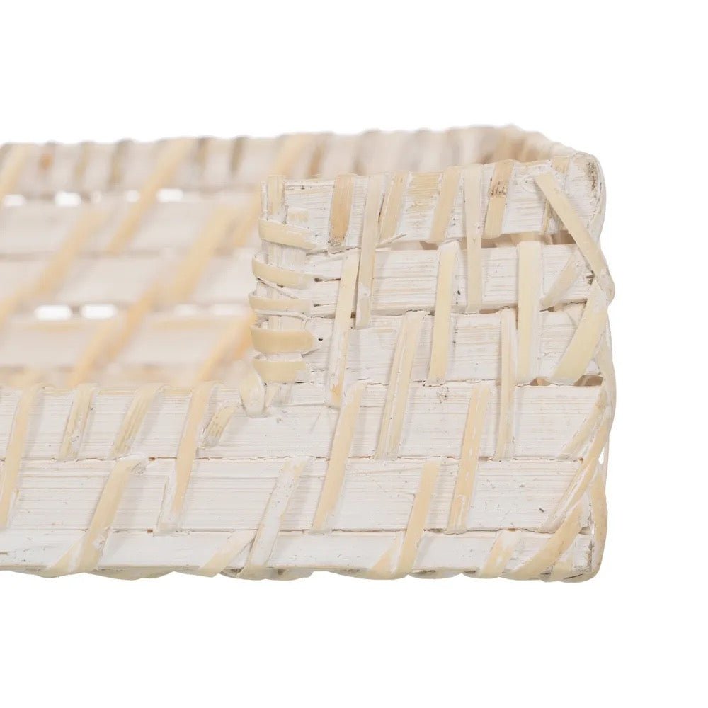Precioso servilletero fabricado con fibras naturales como ratán y bambú en color blanco.
