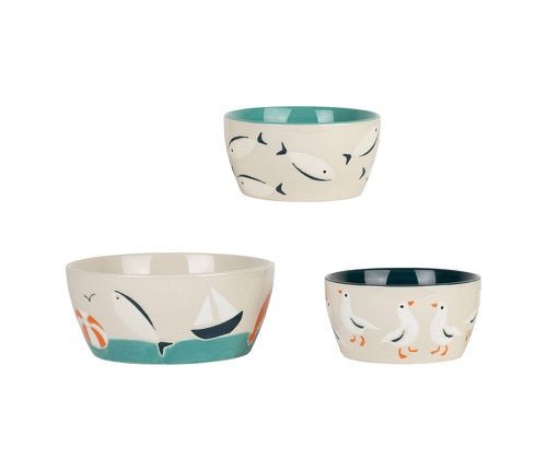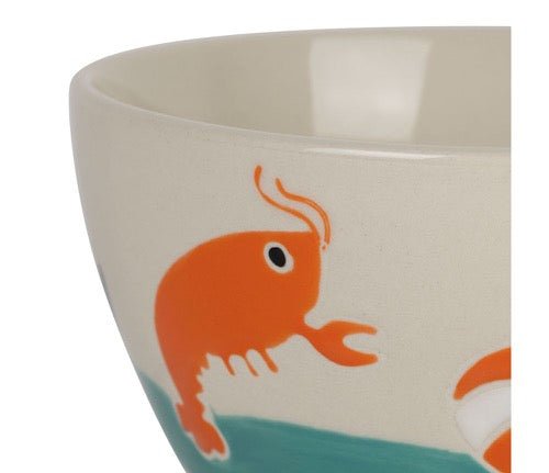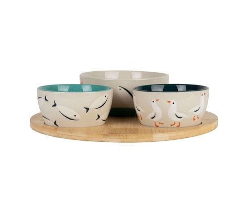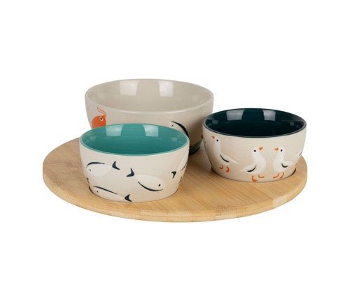 Precioso set de 4 piezas de aperitivo fabricado en gres y bambú natural y multicolor con dibujos de peces y patos.