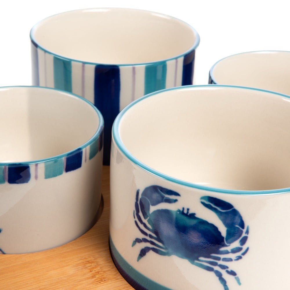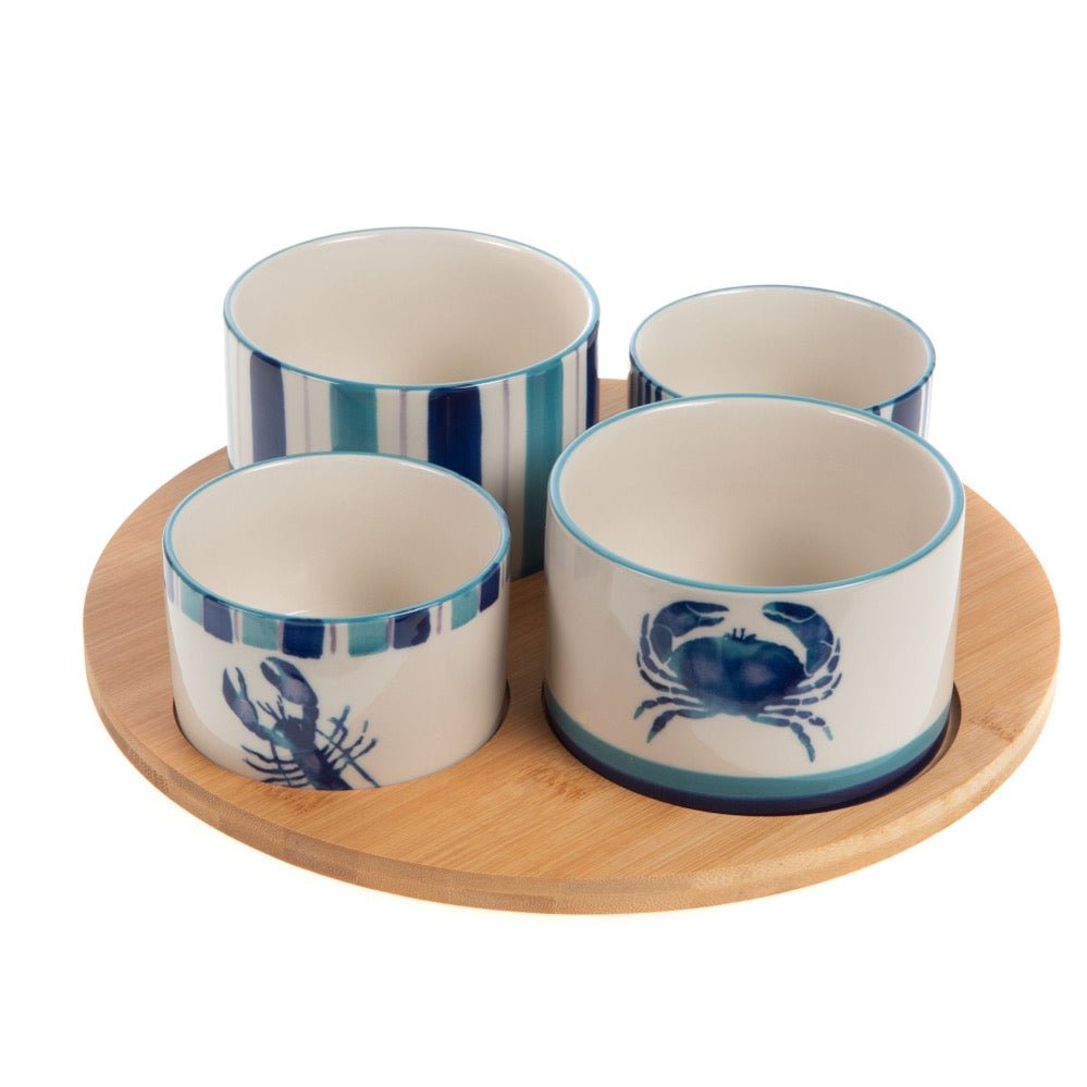 Precioso set de 5 piezas de aperitivo fabricado en gres y madera con colores blanco, azul, turquesa y natural.