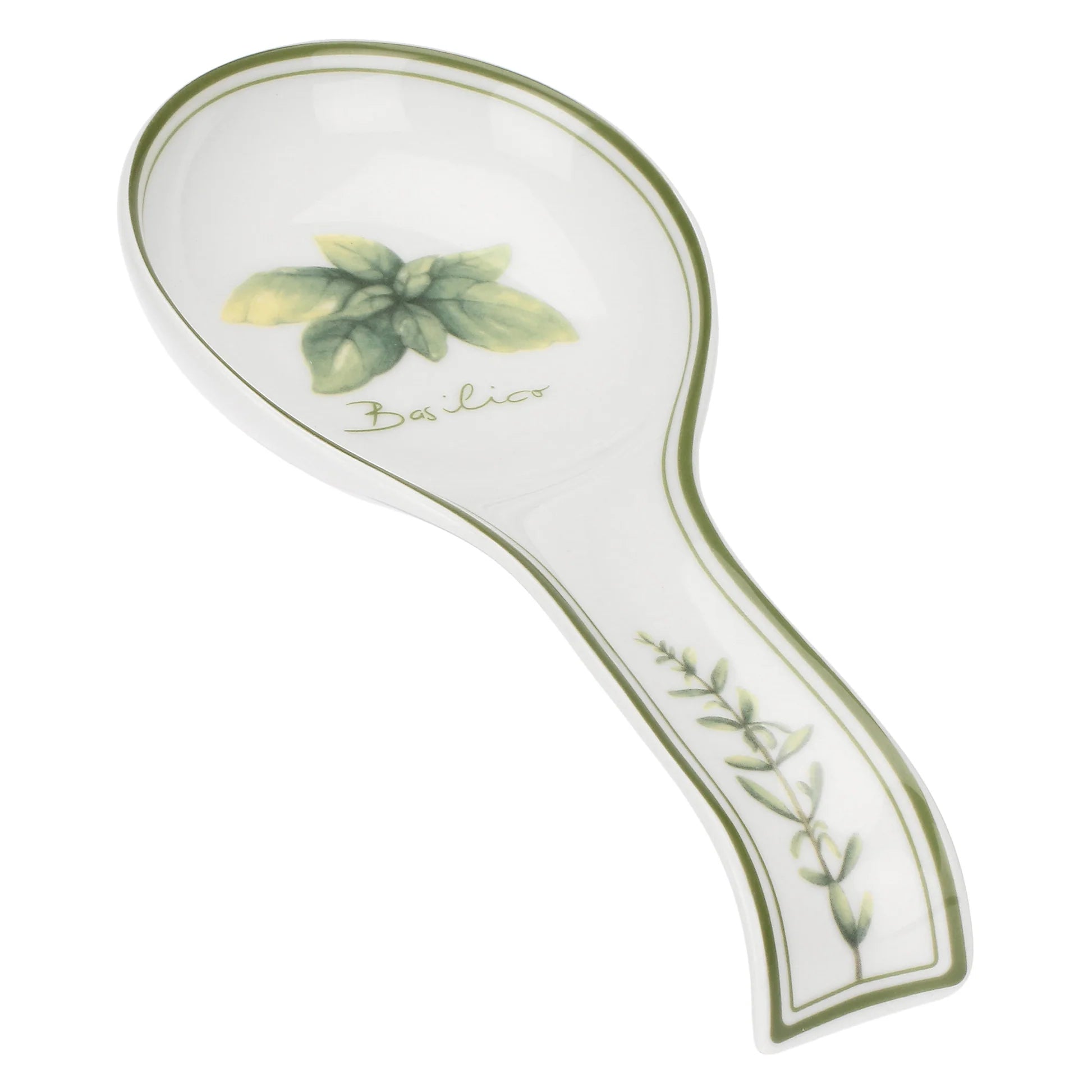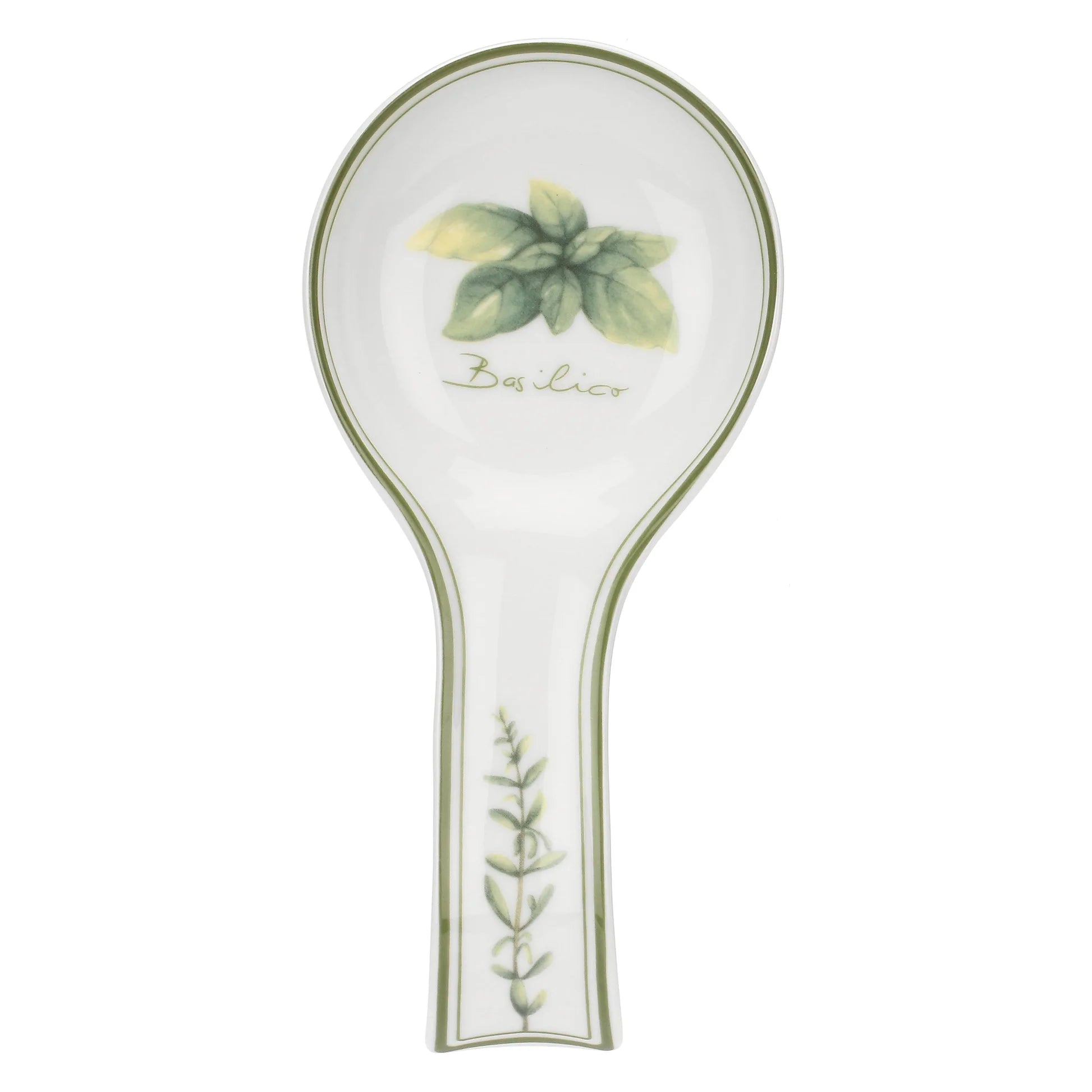 El soporte para cuchara Cultivo Basilio aporta un toque de frescura natural a la cocina gracias a su diseño en porcelana blanca decorada con un delicado motivo de rama verde inspirado en el aroma del albahaca. Su estética atemporal combina funcionalidad y elegancia, protegiendo las superficies mientras añade un detalle decorativo sutil.