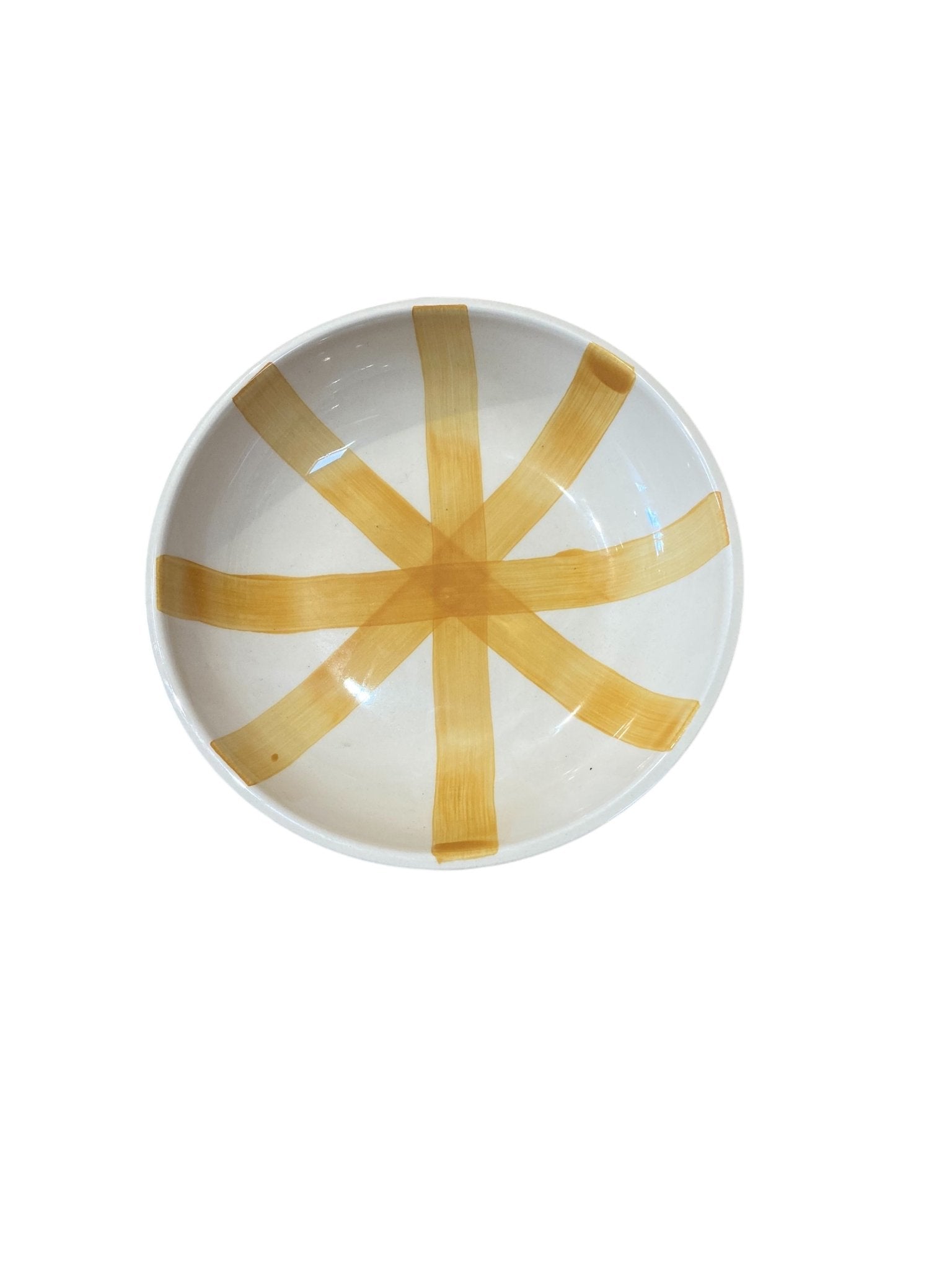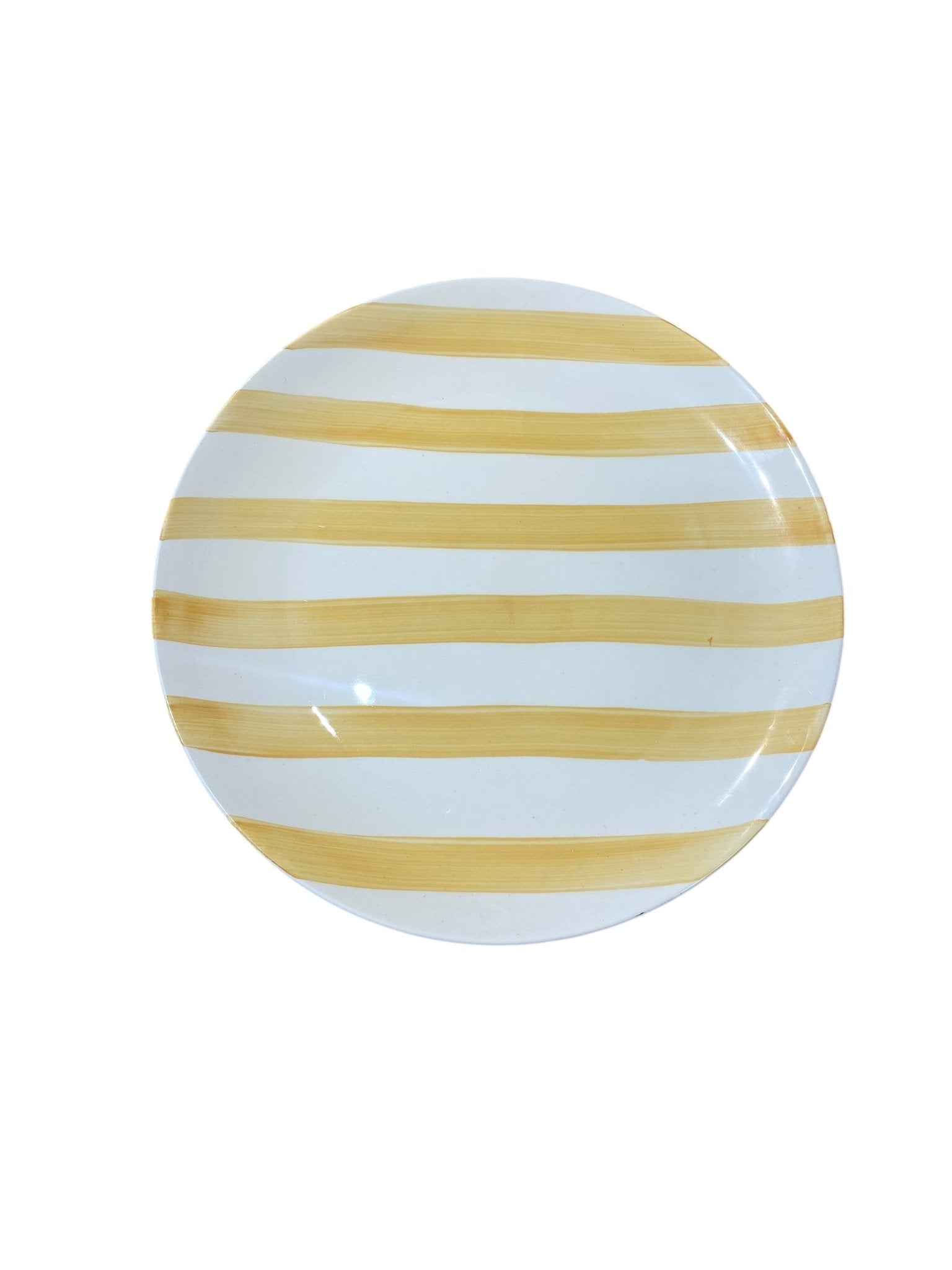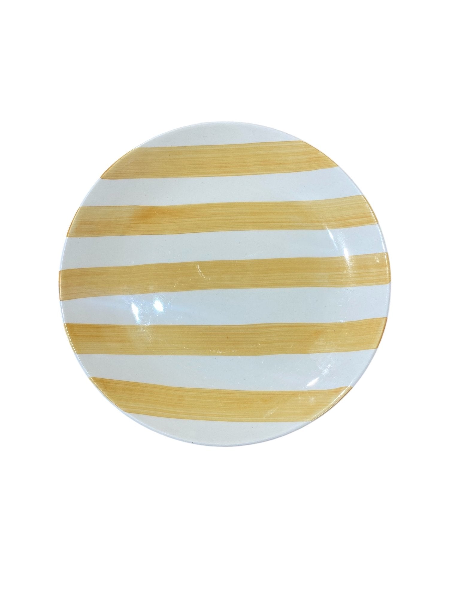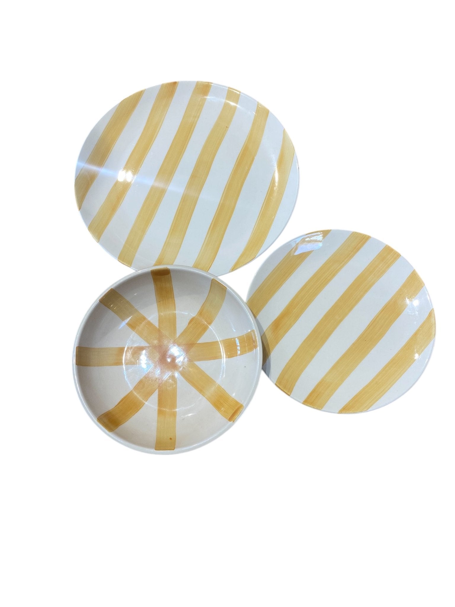Preciosa vajilla de 9 piezas ( 3 comensales) con rayas amarillas fabricada en gres.