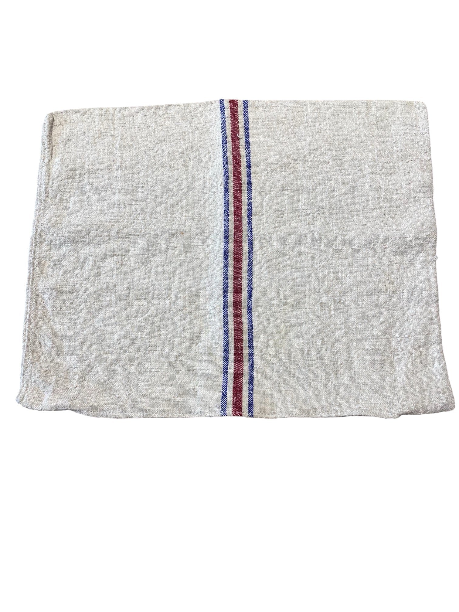 Funda de cojín de lino antiguo de los sacos de grano procedentes de las antiguas granjas de Centroeuropa. Detalle de franjas verticales en color rojo y azul. La medida de alguna de las fundas puede variar algún centímetro arriba o abajo en función del saco usado para la confección.