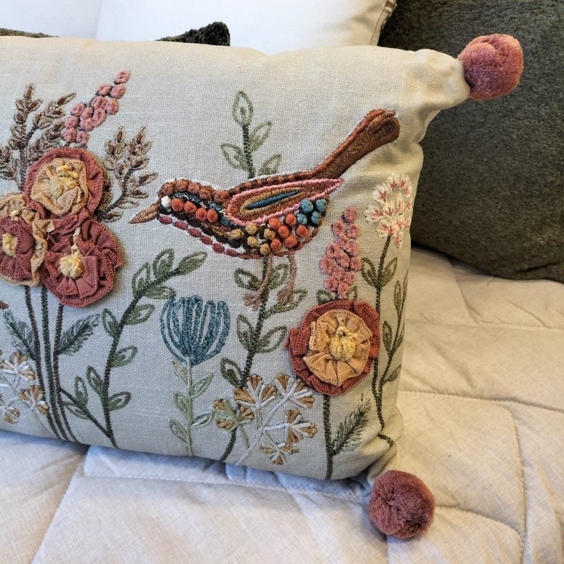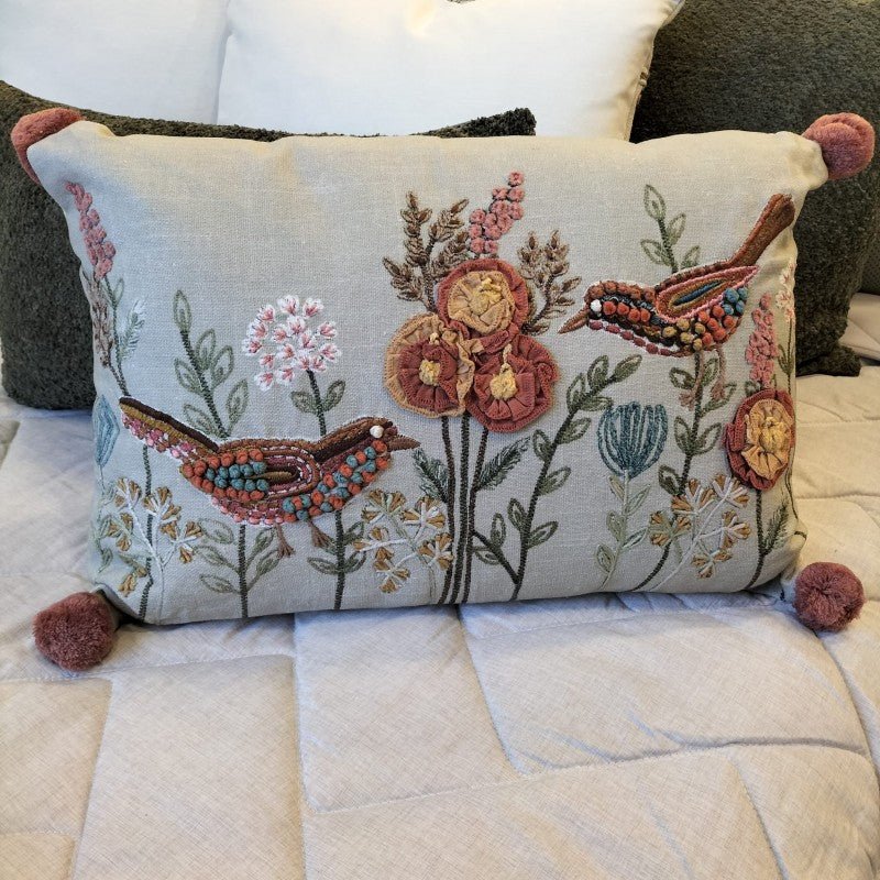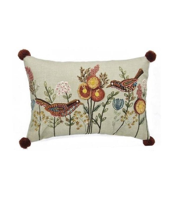 Precioso cojín fabricado en tela con detalles de pájaros y flores en relieve multicolor con pompones en las esquinas.