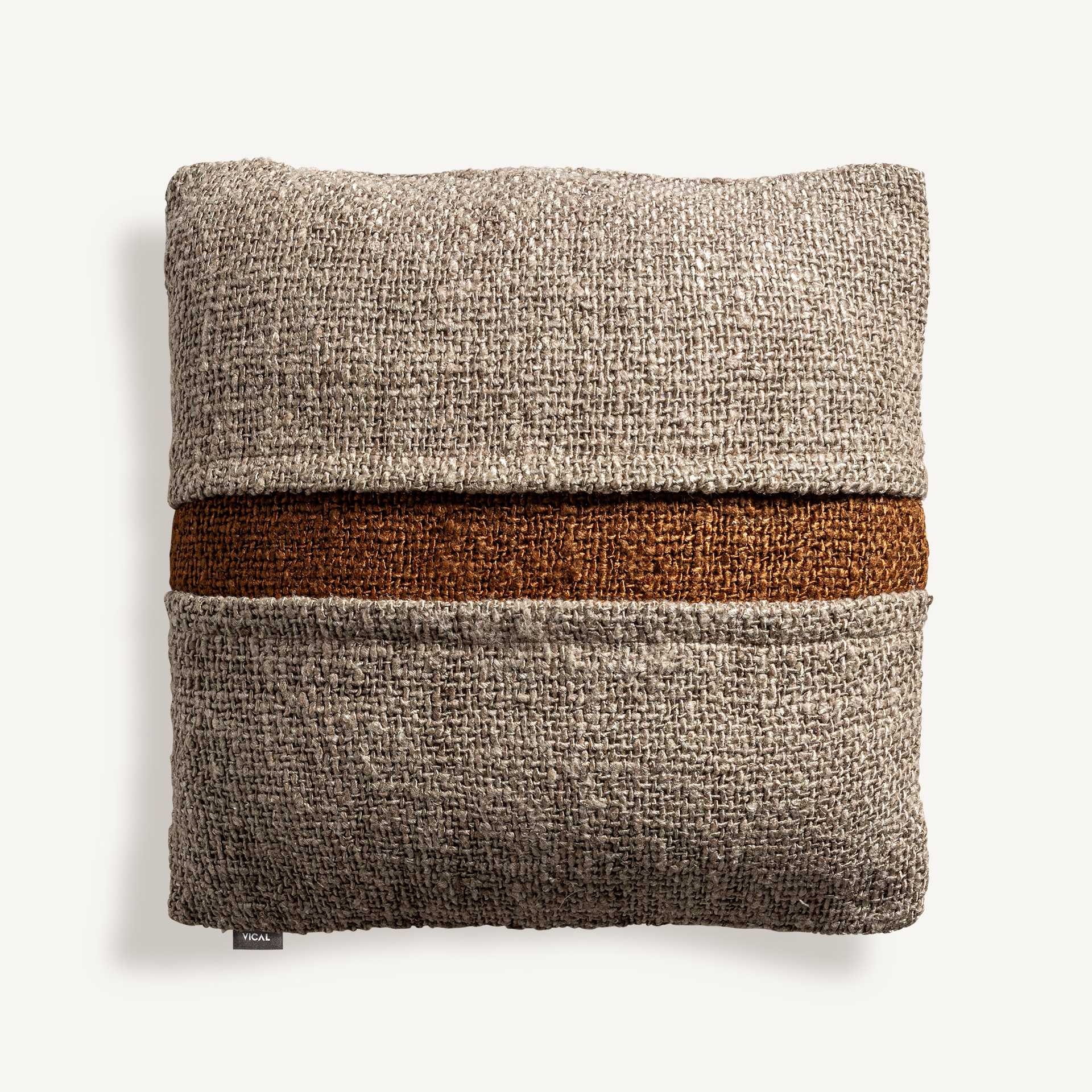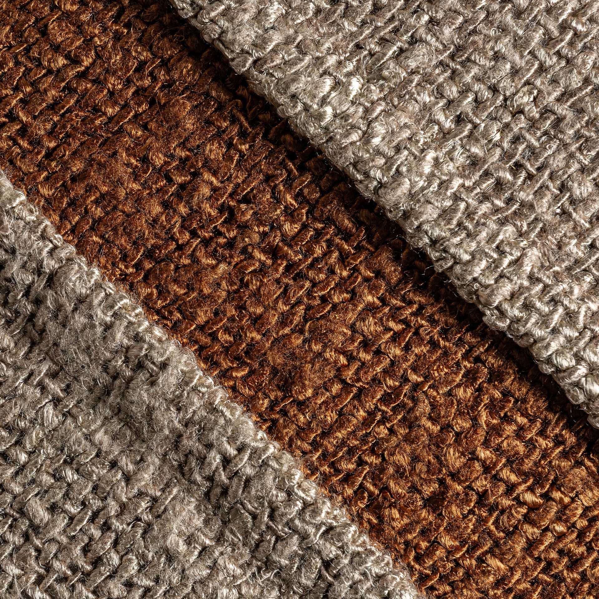 Modulí reinventa el clásico con un toque inesperado. Su base de algodón beige jaspeado transmite calidez y textura, mientras que una franja de terciopelo aporta un contraste sofisticado que eleva cualquier espacio.